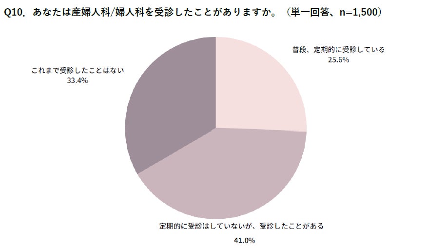 ☑定期的に受診している女性は全体の25.6%。一方で妊娠経験のない女性の中で、「これまで受診したことがない人」は44.7%と、全体の半数近くに及ぶ。