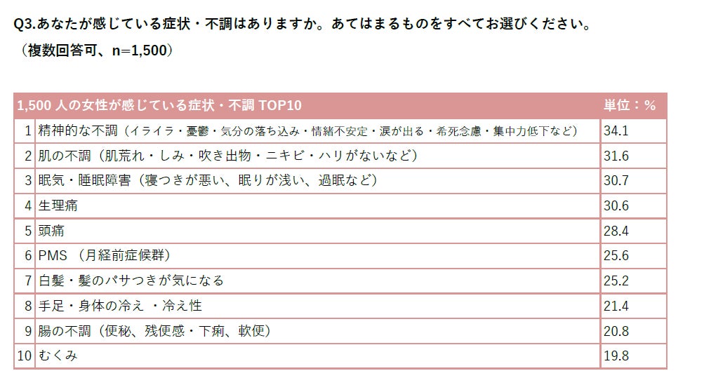 ☑婦人科系の不調の中で、最も多いのが「生理痛(30.6%)」、ついで「PMS(月経前症候群)(25.6%)」と、生理にまつわる悩みを抱える女性が多い。