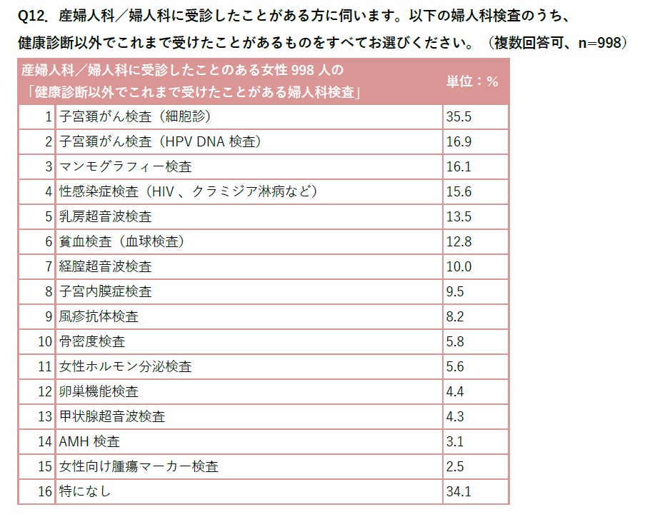 ☑産婦人科/婦人科を受診したことのある女性(998人)のうち、健康診断以外でこれまで受けたことのある婦人科系の検査は「子宮頚がん検査(細胞診)(35.5%)」「子宮頚がん検査(HPV DNA 検査)(16.9%)」と、昨今子宮頸がんの対策ニーズが高まっている傾向にあるといえる。