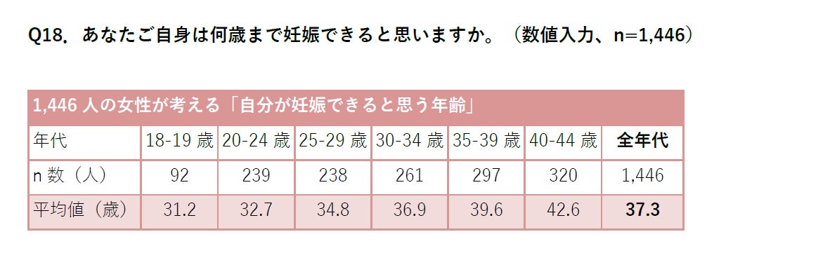☑妊娠を望む女性(「機会があれば妊娠したい」「絶対に妊娠したい」と答えた層)は、全体の40.9%、「自身が妊娠できると思う年齢」の平均値は、37.3歳と、昨年同様高齢出産と言われる35歳を上回る結果に。