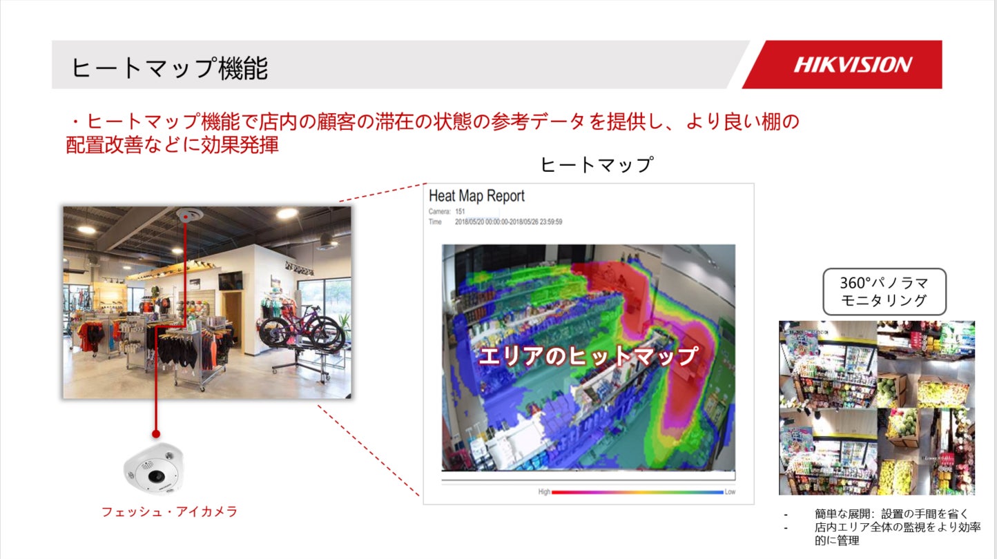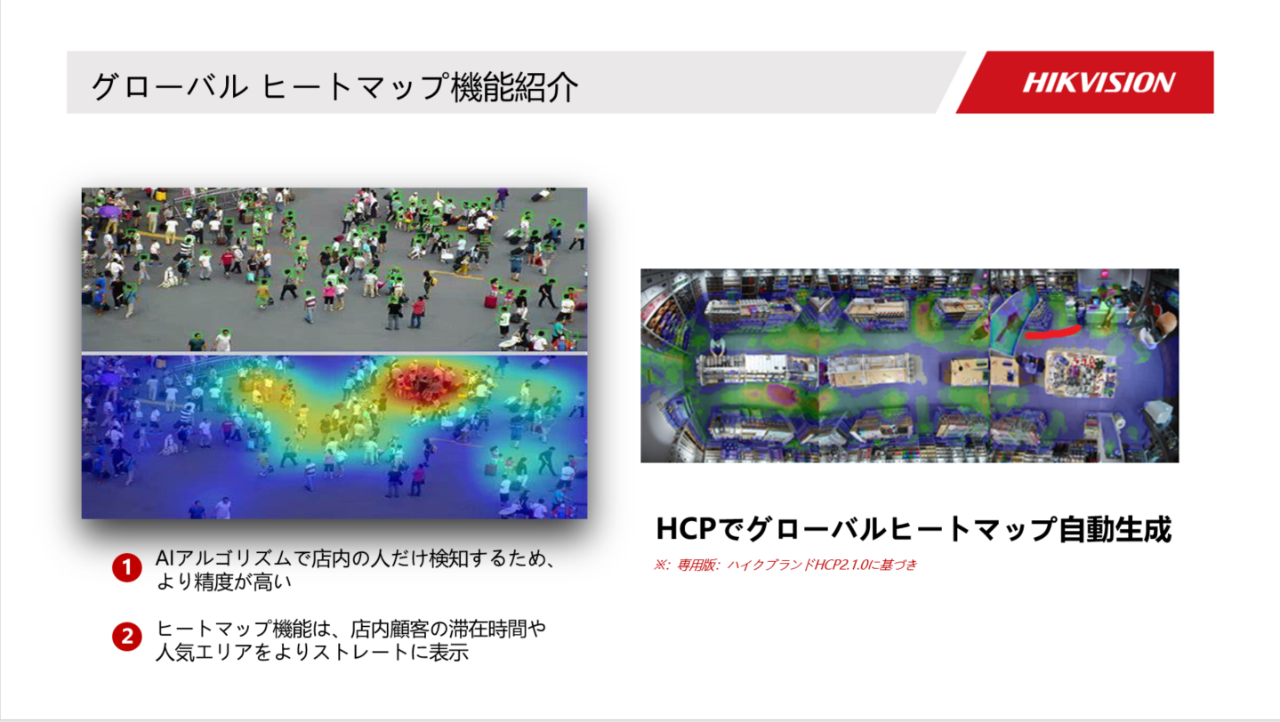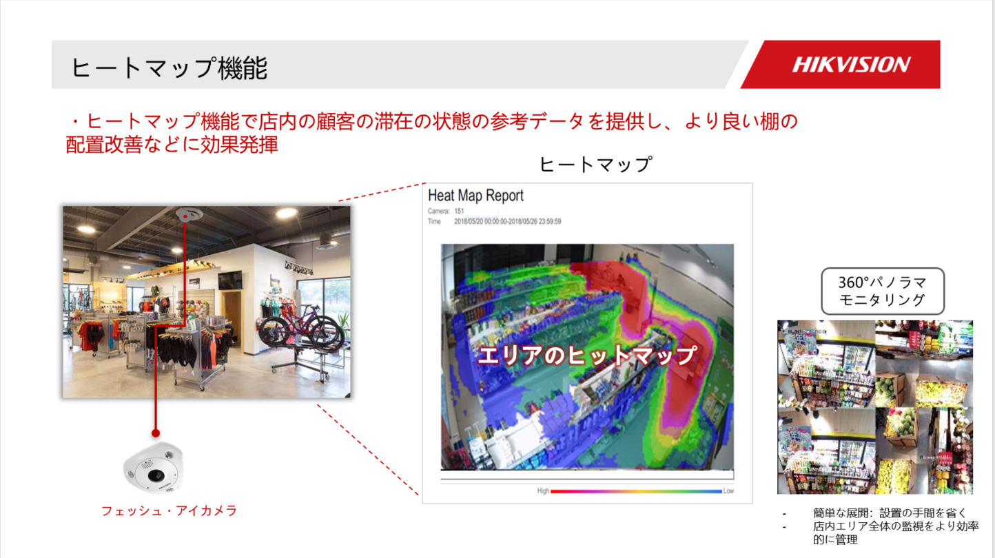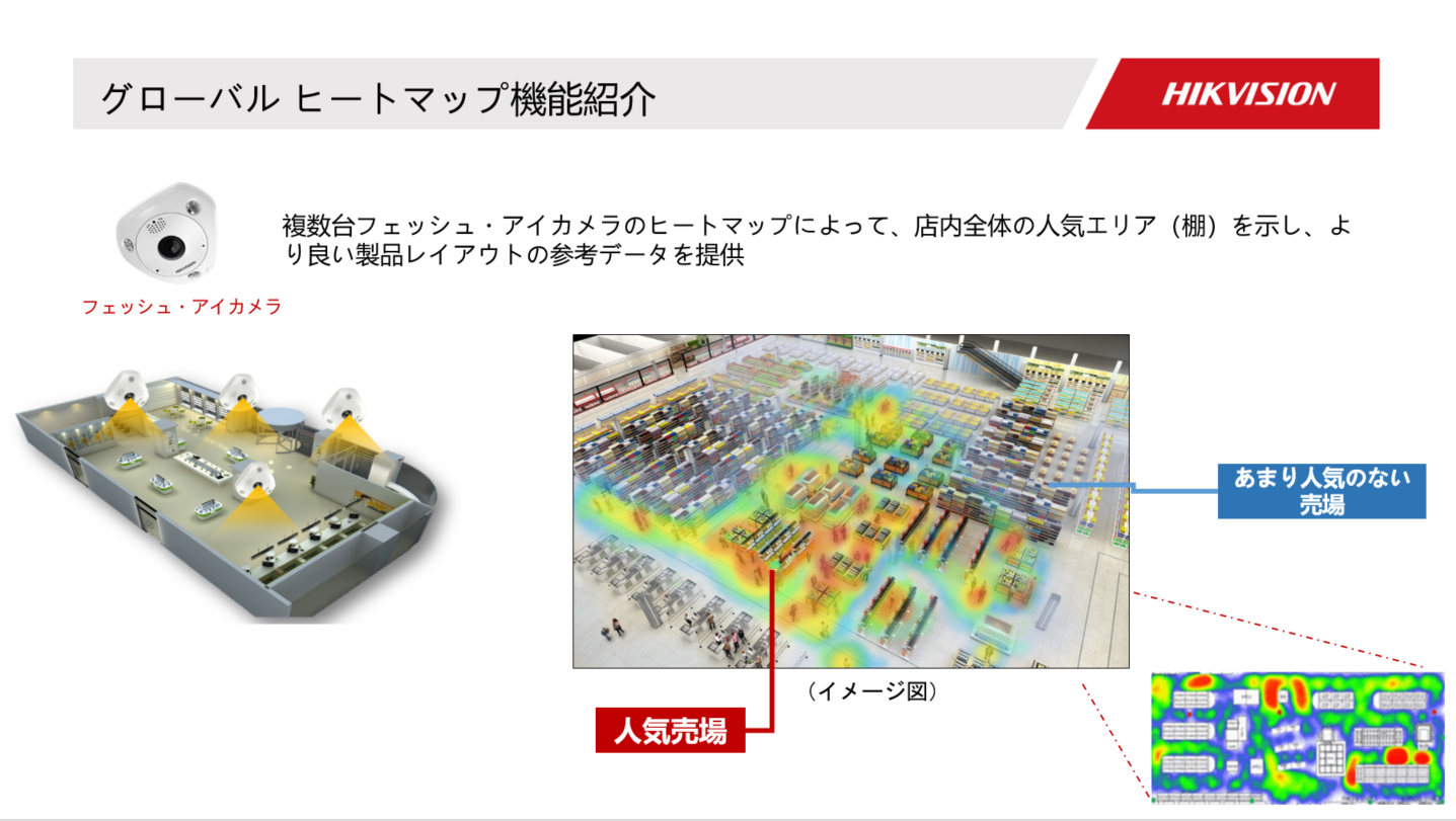 今まで小型店舗でフェッシュ・アイカメラでヒートマップ機能が利用されてきましたが、面積が大きなスーパーなどの中・大規模店舗の場合は、AI グローバル ヒートマップ ソリューションを推奨します。