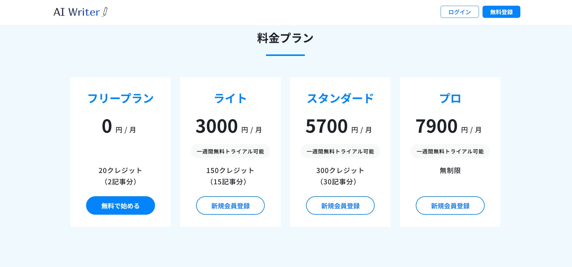 AI Writerのサービスサイトにアクセスし、上記画像の「無料で始める」というボタンから登録を行ってください。