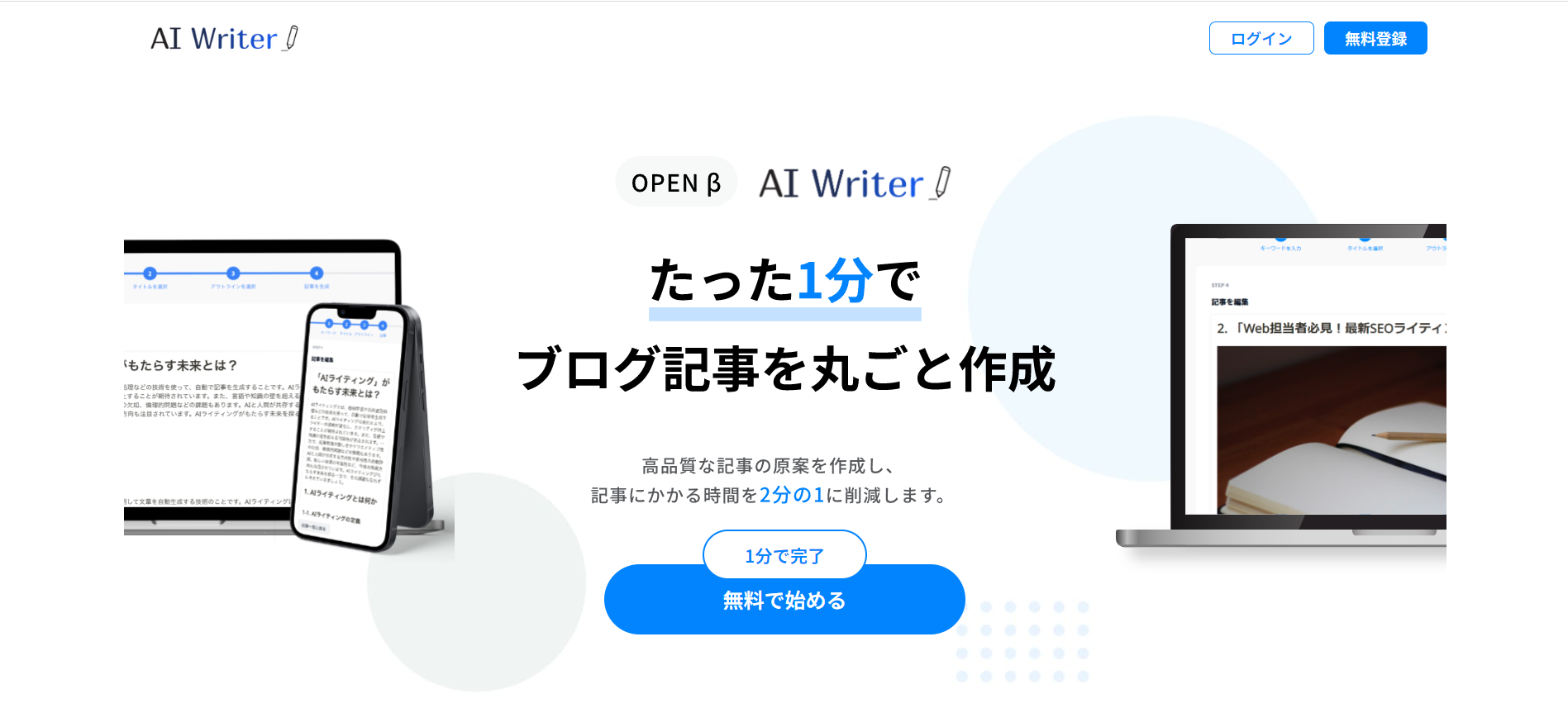 AI Writerは、たった1分で丸ごとブログ記事を作成できるサービスです。