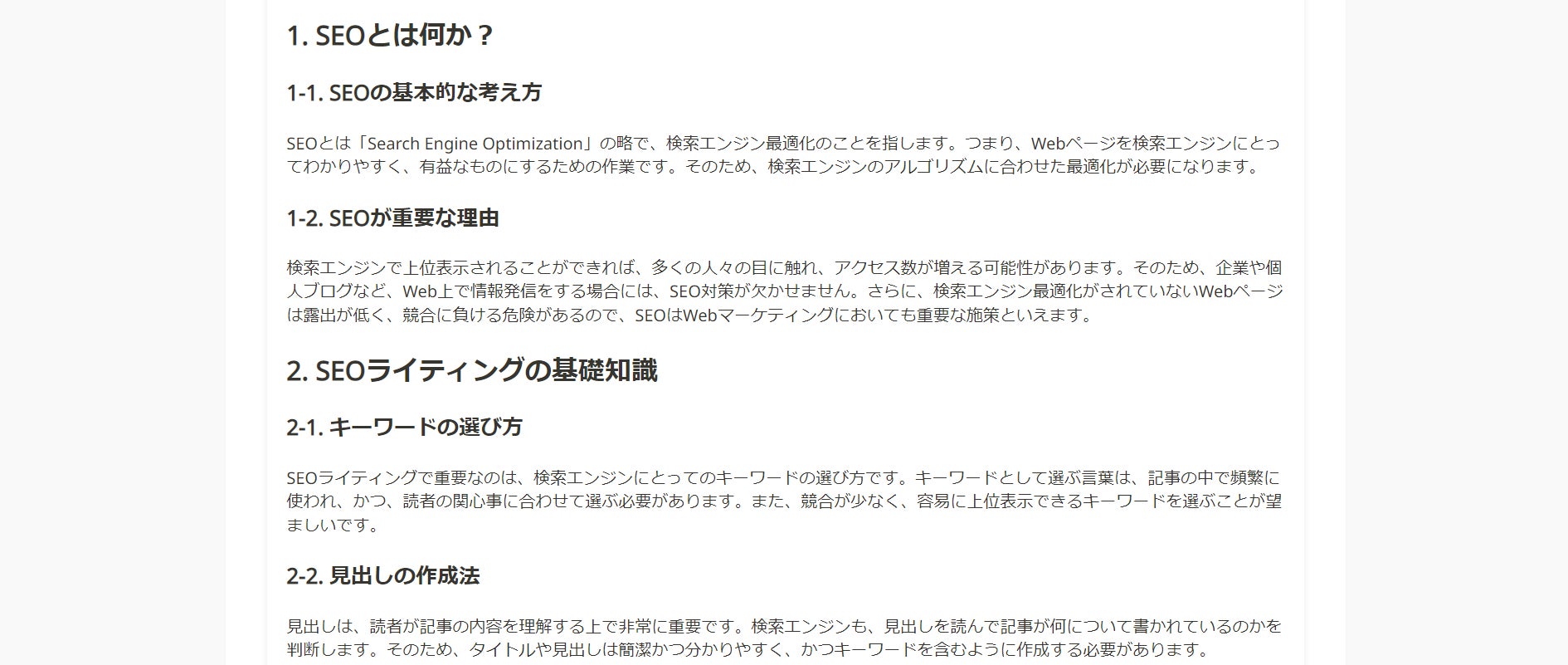 記事の構成を選択後、記事構成に沿った記事が生成されます。AI Writerが生成する記事は、完璧な記事というわけではないので、手直しが必要となります。