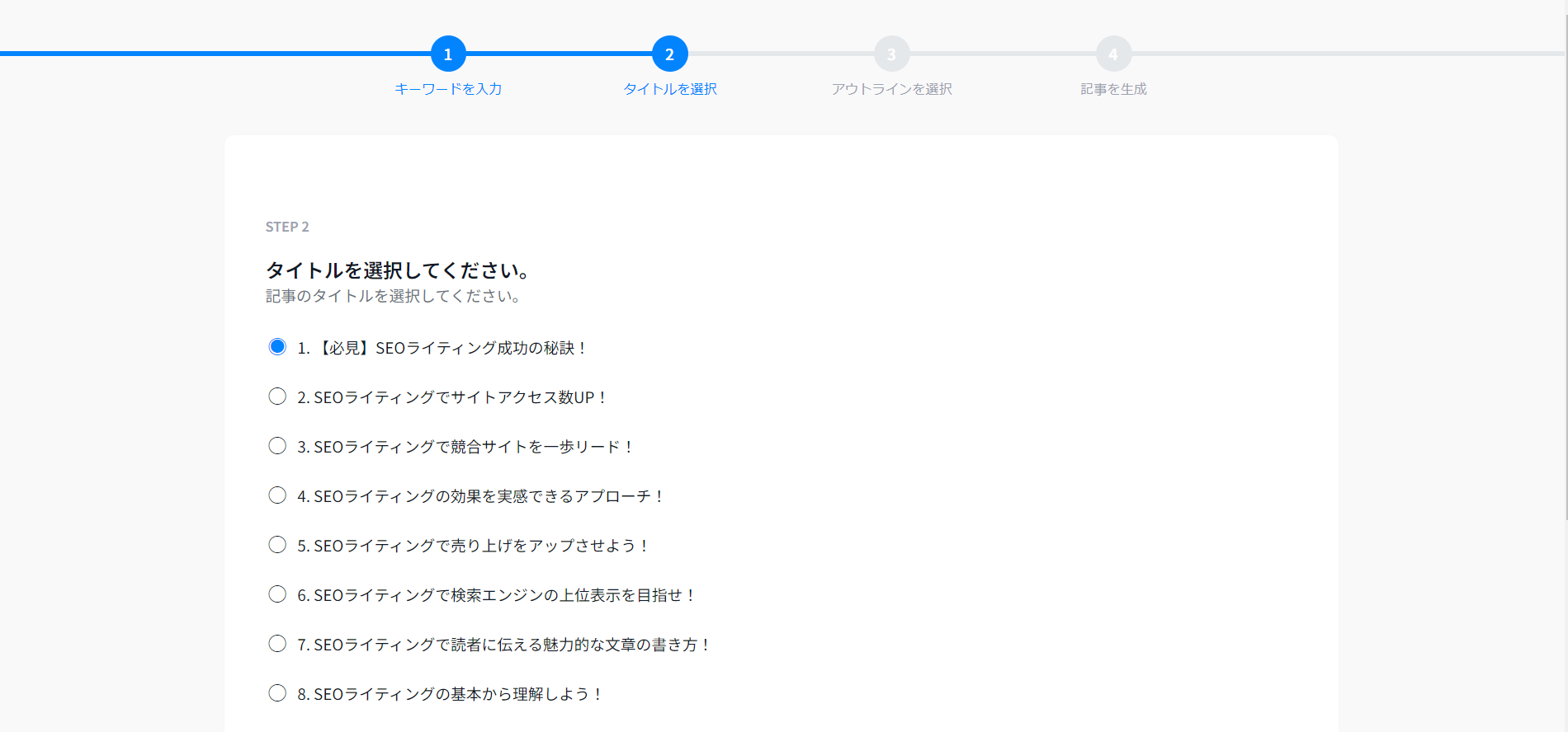 キーワードからタイトルが10つ生成されるので、好きなタイトルを選択します。