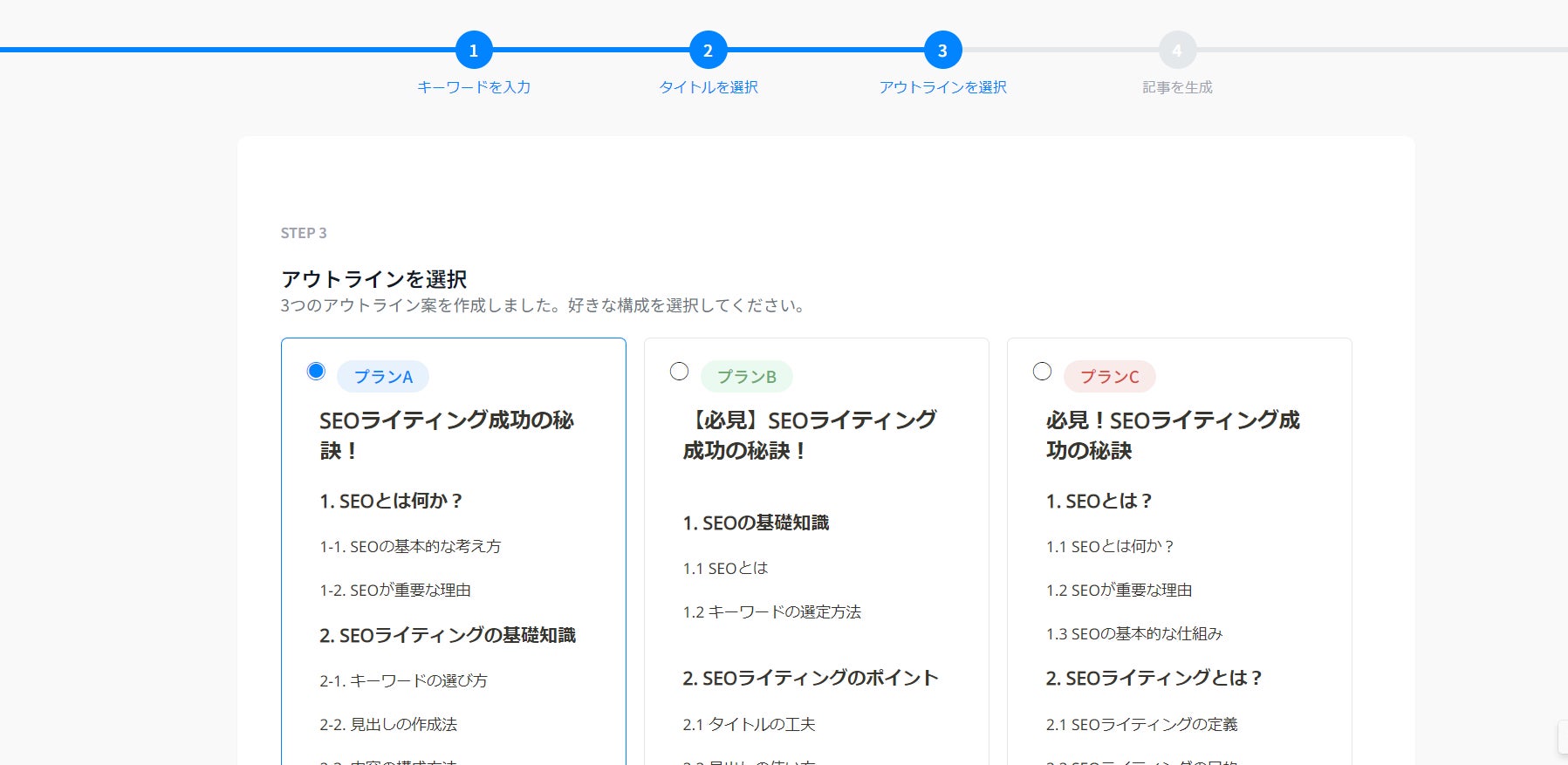 タイトルを選択すると3つの記事構成を生成してくれます。希望する記事構成に近いものを選択します。