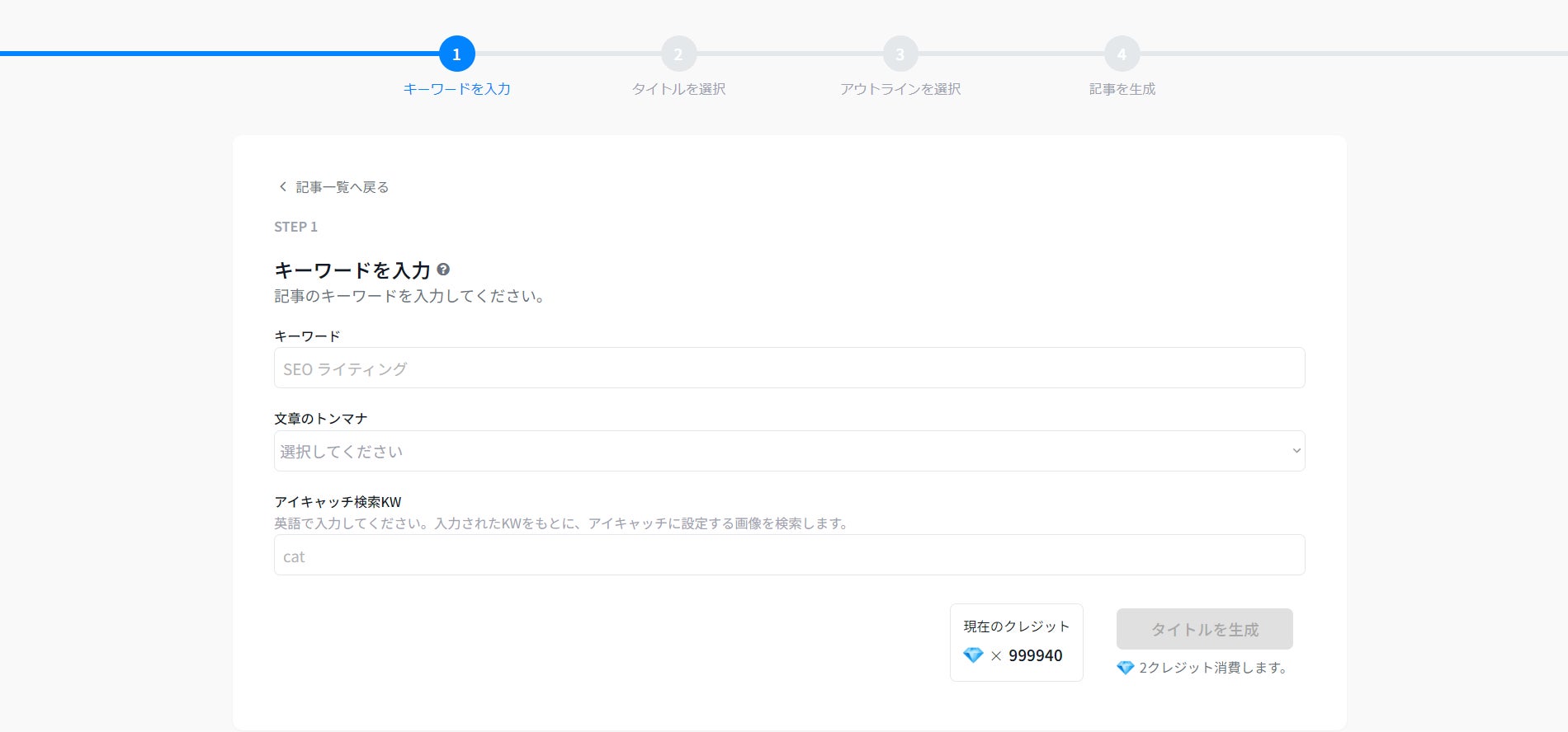記事制作機能とは、記事作成に必要なキーワード等の情報を入力するだけ、ブログ記事を生成する機能のことです。