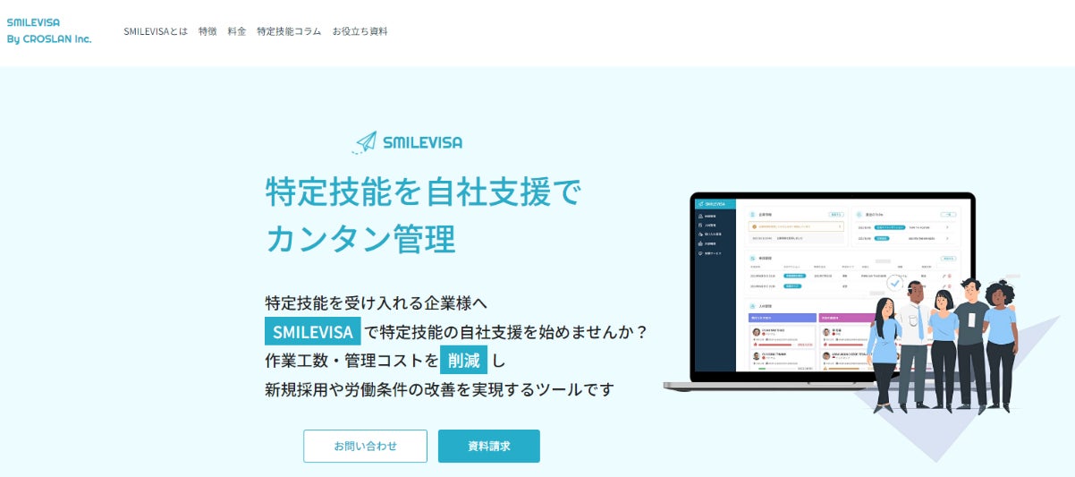 株式会社CROSLANは特定技能外国人を受け入れる企業の課題解決を目指し、特定技能外国人を自社で管理できるクラウドサービス「SMILEVISA」提供を2022年の4月より行っています。特定技能外国人の管理コストの増大や、自社支援に切り替える際のノウハウ提供を行っており、自社支援成功率は100%(2023年5月時点)を実現しています。