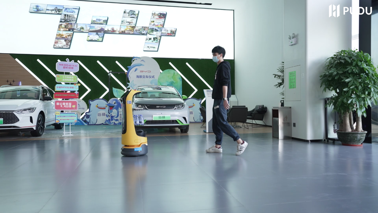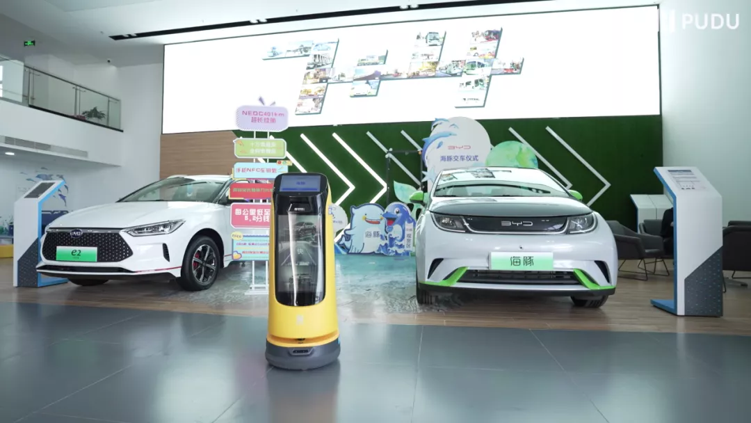中国の新エネルギー車(NEV)大手「比亜迪(BYD)」オーシャンシリーズ(深セン粤星ディーラー)はPudu Robotics(本社:中国深セン、日本法人Pudu Robotics Japan 株式会社 代表取締役社長:張涛)の配送・案内ロボット「KettyBot」を導入し、新ブランド成長のために注目を集めています。「KettyBot」の鮮やかな黄色のボディと細身でコンパクトなフォルムが、ディーラー内のスタイリッシュで時代の最先端をいく「海豚(Dolphin)」、「e2」、「宋PLUS EV」などセダンの魅力を一層引き立てます。