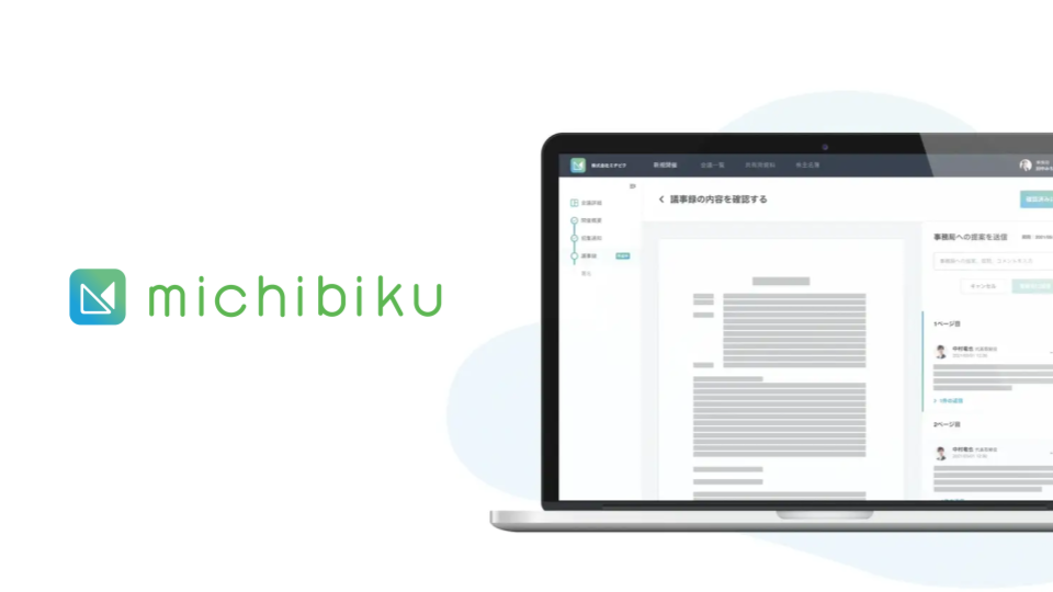 2021年9月より、取締役会DXプラットフォーム『michibiku』を提供。取締役会のDX化による会議情報の一元管理をきっかけに、業務の効率化・評価・改善をおこない、取締役会の本質的な機能発揮を支援します。企業の重要機関における最適な場づくりをサポートし、日本企業の成長促進を支援します。