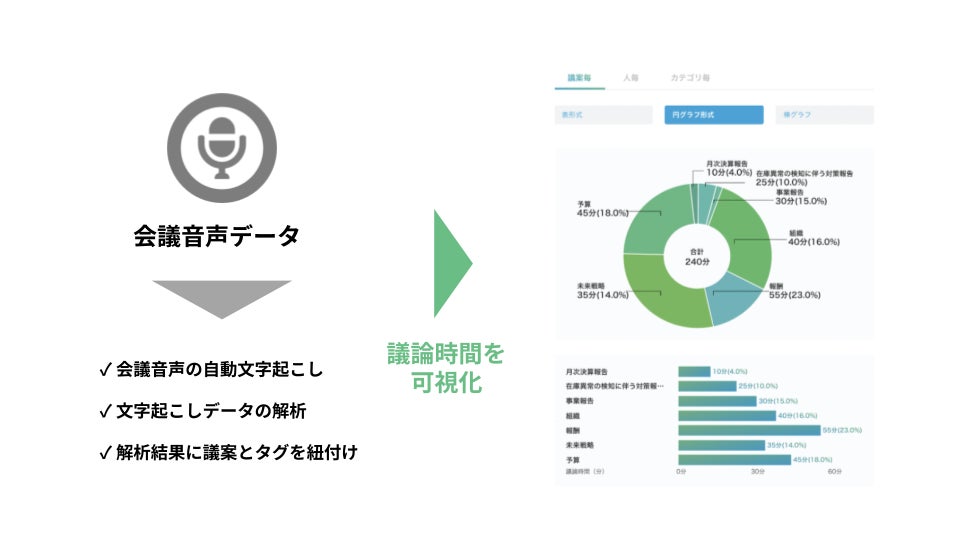 書き起こしテキストに付与された議案やタグごとで会議に使った時間を集計し、テーマごとに可視化することができます。議論時間の傾向を可視化することで、PDCAを回すための定量データとなります。