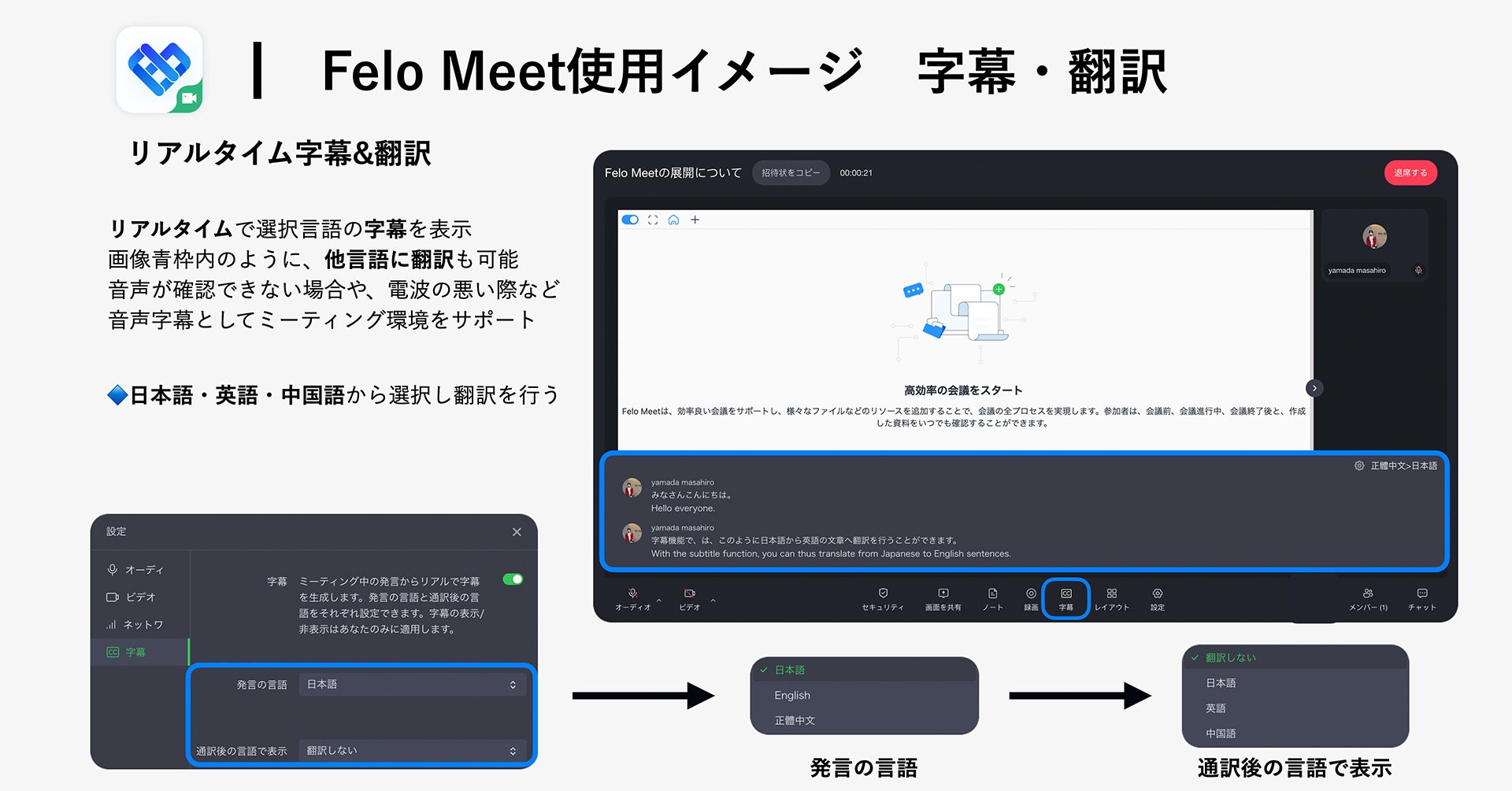 今回Felo Meetではそういった状況でも問題なくミーティングを継続していただけるよう、字幕・翻訳機能を今回実装いたしました!