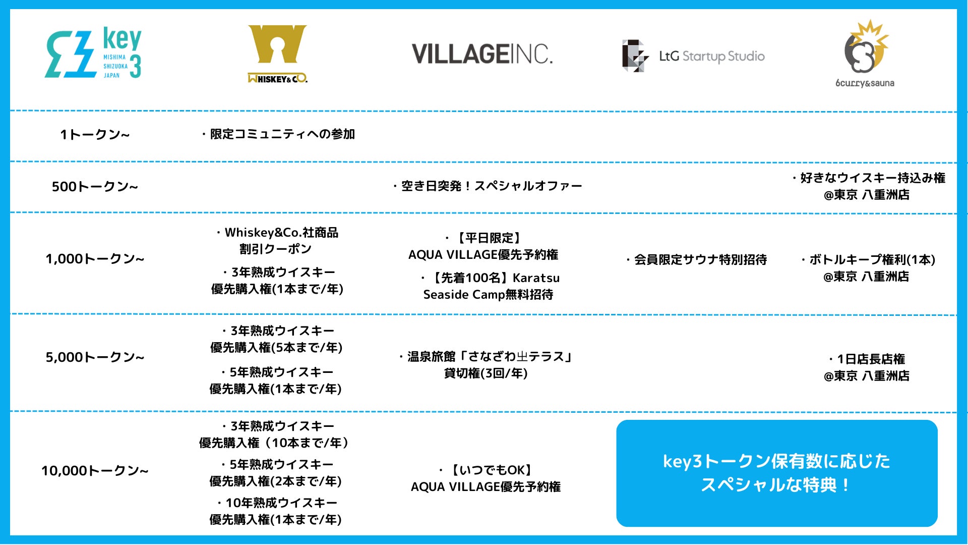 クラフト・スピリッツの製造・販売を行うWhiskey&Co.株式会社(本社:東京都渋谷区、代表取締役:大森章平)の「三島ウイスキープロジェクト」は三島発の3ブランドと提携しkey3トークン購入サポーターへ新たにコラボ特典を追加しました。