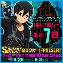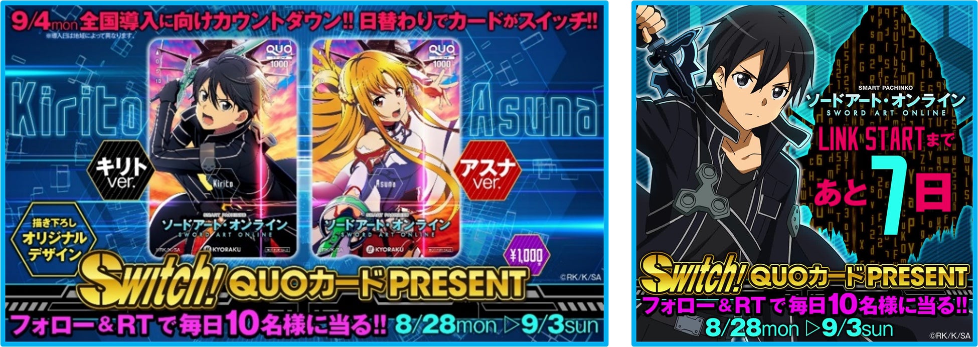「スマートぱちんこ ソードアート・オンライン」の全国導入前の7日間(8月28日~9月3日)、KYORAKU公式「X」(旧:twitter)にて、毎日カウントダウンをおこなうとともに、フォロー&RTで当るQUOカードプレゼントキャンペーンを実施いたします。QUOカードのデザインは、「キリトver.」「アスナver.」の2種類を毎日Switch!