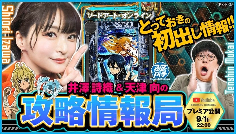 アニメ「ソードアート・オンライン」で、アルゴ/ピナの声優「井澤 詩織」さんと、SAO大好き芸人の「天津・向」さんによる「スマートぱちんこ ソードアート・オンライン」攻略情報局を、9/1(金)22:00より、YouTube KYORAKUチャンネルにてプレミア公開いたします。パチンコで再現しているアニメの世界観や、とっておき初出し情報を紹介。二人の息の合った掛け合いにもご注目!是非、ご視聴ください。