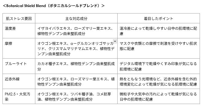 紫外線や温度差、摩擦、ブルーライト、PM2.5など、日中にさらされる多様な環境ストレスに向き合うため、独自の〈Botanical Shield Blend(ボタニカルシールドブレンド)〉を採用しました。