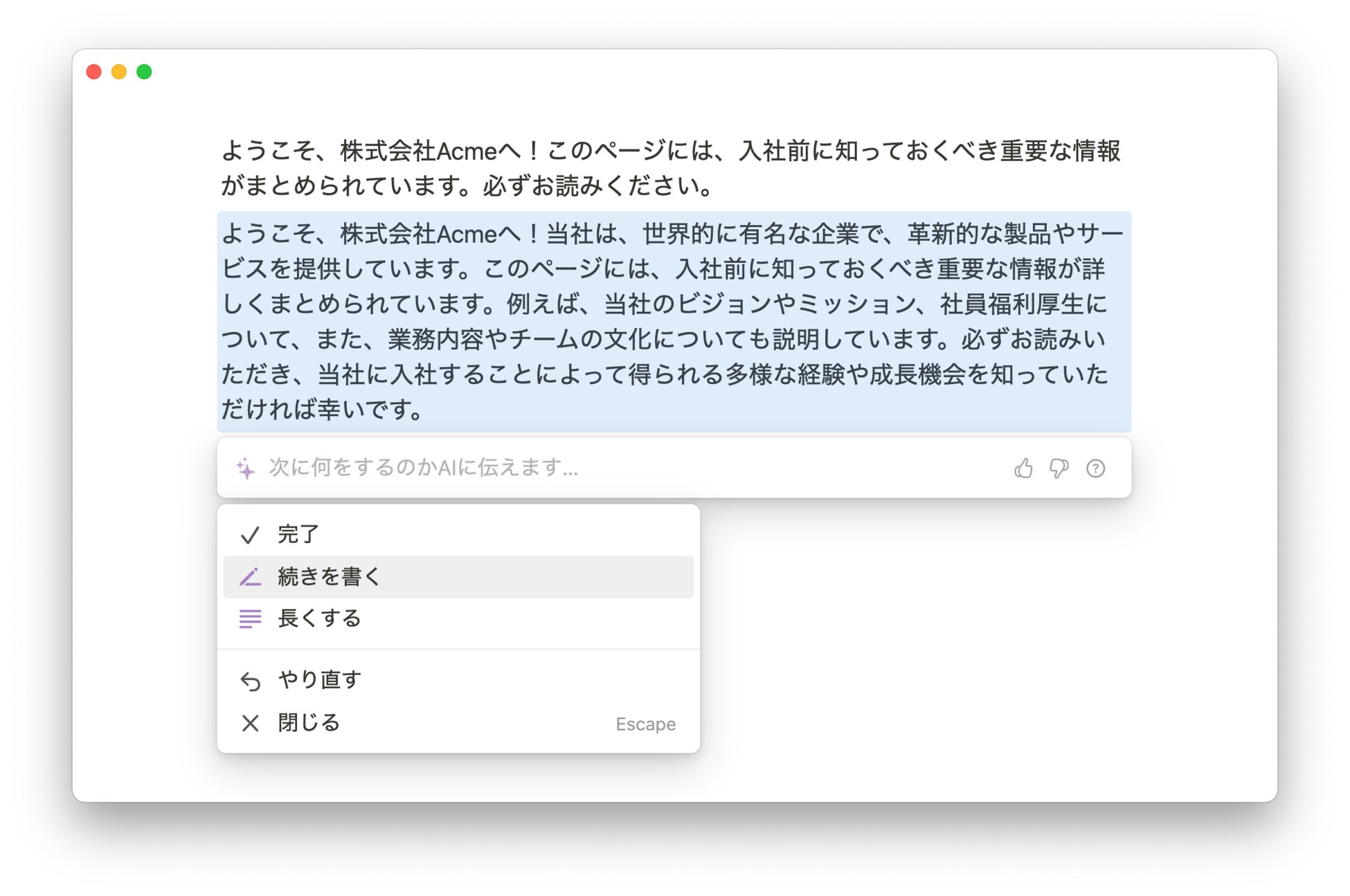 情報の整理・要約作成:ページ全体や範囲選択した文章の情報を整理したり、会議の議事録やプロジェクト概要の要約を作成・翻訳することができます。
