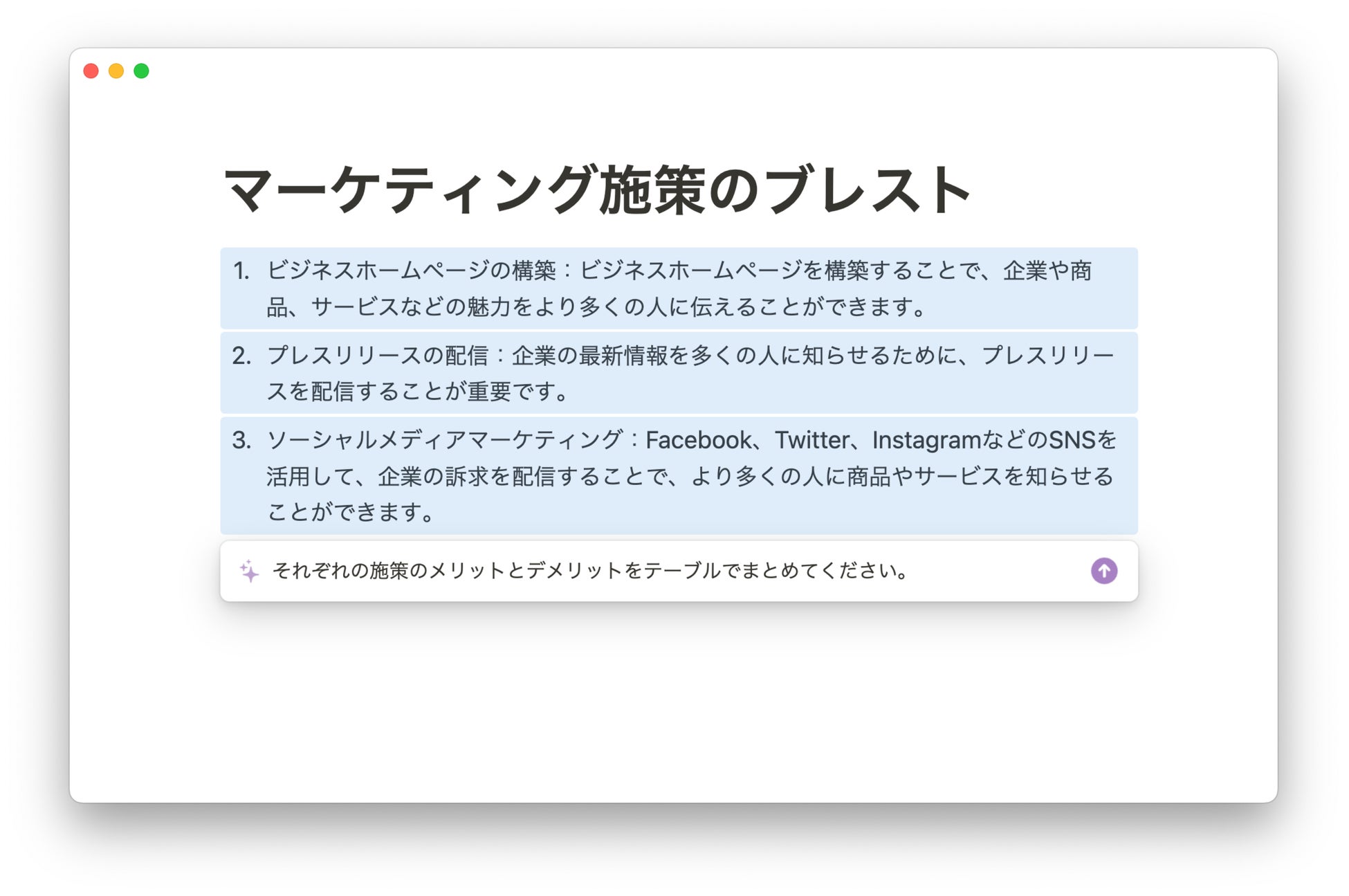 新しいアイデアのヒントを得る:アイデアのブレインストーミングをサポートしたり、メリット・デメリットのリスト化、ブログ、プレスリリース、会議のアジェンダなどさまざまなトピックスに対してドラフトを作成します。