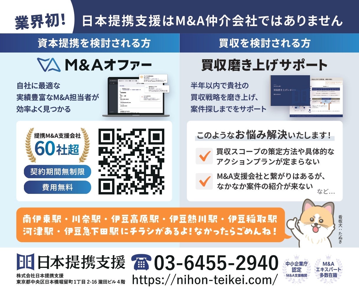 M&Aの総合相談窓口を運営する株式会社日本提携支援(本社:東京都中央区、代表取締役:大野駿介)は、このたび、伊豆急沿線地域の後継者不在に悩む企業や成長戦略を模索する企業への支援を目的とし、伊豆急行様のご協力のもと、車両内における広告掲出を開始いたしました。