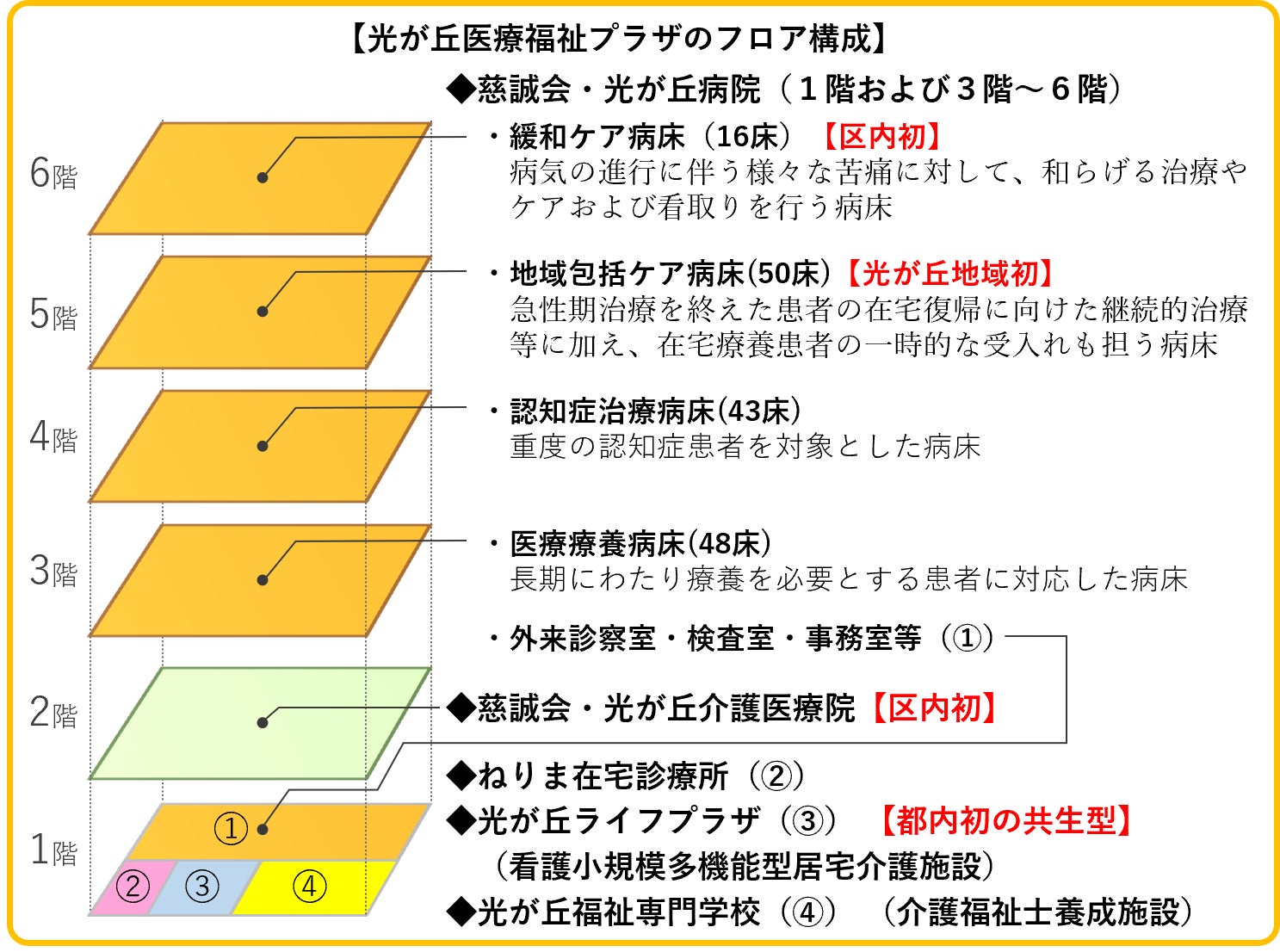 医療分野では、緩和ケア病床を備えた157床の病院や在宅医療を担う診療所、介護分野では、介護医療院や看護小規模多機能型居宅介護事業所、介護福祉士を養成する専門学校によって構成される。そのうち、緩和ケア病床と介護医療院は、区内初の設置となる。