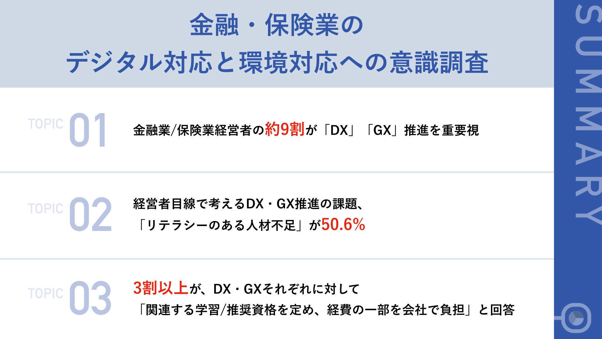 【金融・保険業界で今後求められる人材とは?】金融経営者の約9割が「DX」「GX」推進を重要視!一方で「リテラシーのある人材不足」の課題も浮上