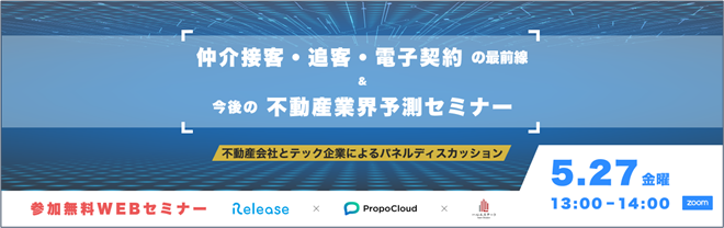 業界最安値(※)の不動産売買特化型電子契約・契約書管理サービス「RELEASE(レリーズ)」の開発・運営を行うGOGEN株式会社(本社:東京都渋谷区、代表取締役CEO:和田浩明)は、2022年5月27日(金)13時より、「不動産仲介の接客・追客・電子契約の最前線と、今後の不動産業界予測セミナー」を株式会社Housmart(代表取締役:針山 昌幸)、および一心エステート株式会社(代表取締役:高田 一洋)と共催いたします。