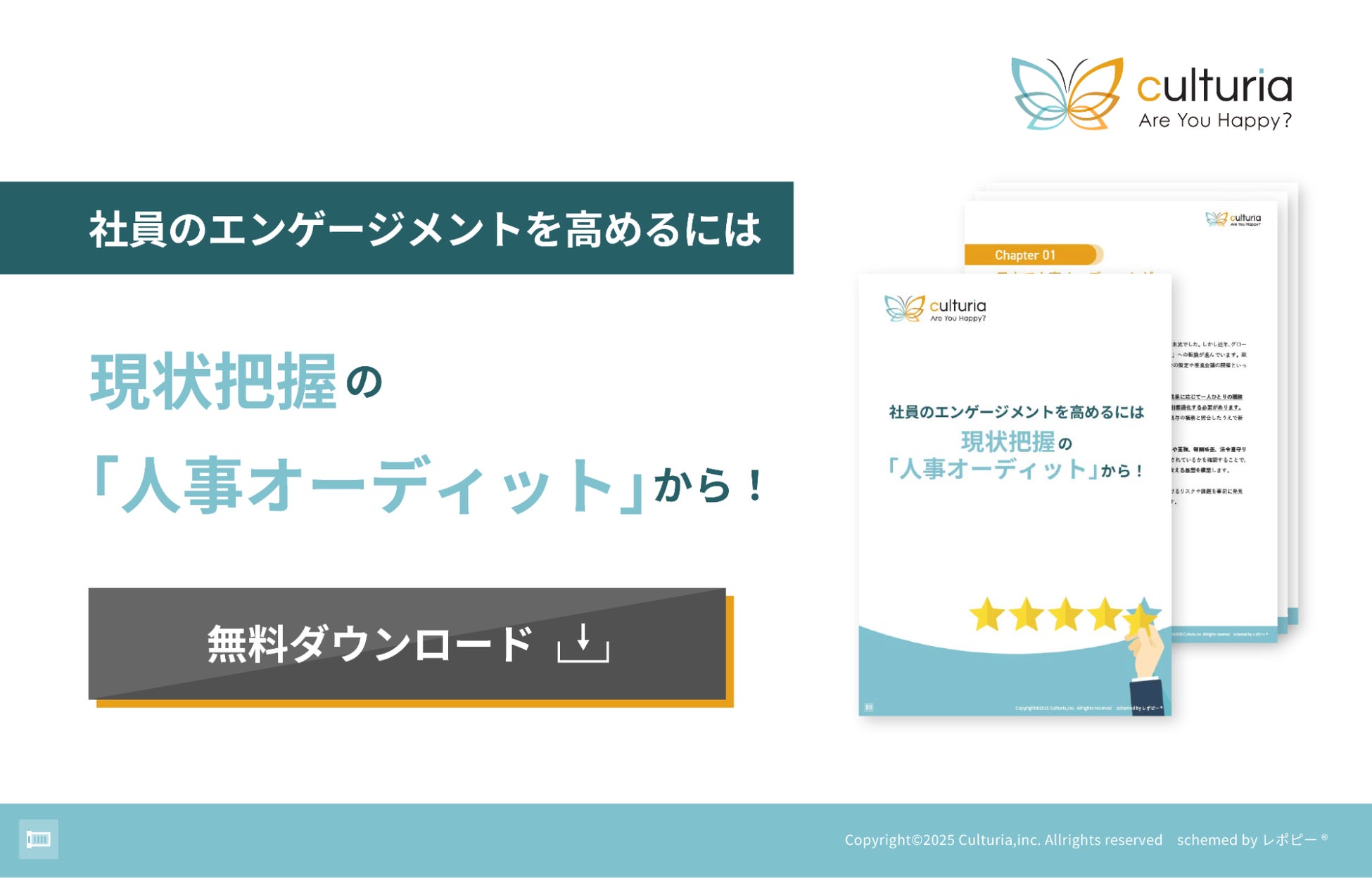 「社員のエンゲージメントを高めるには 現状把握の 『人事オーディット』 から!」をダウンロードする:https://culturia.co.jp/hr-audit-download