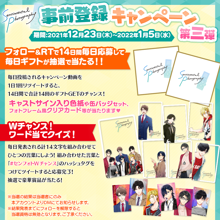 『センチメンタルフォトグラフィ』事前登録キャンペーン第三弾開始。フォロー&RTでキャストサイン入り色紙等、豪華ギフトが毎日当たる!さらに動画の文字を繋げて応募するWチャンスも!