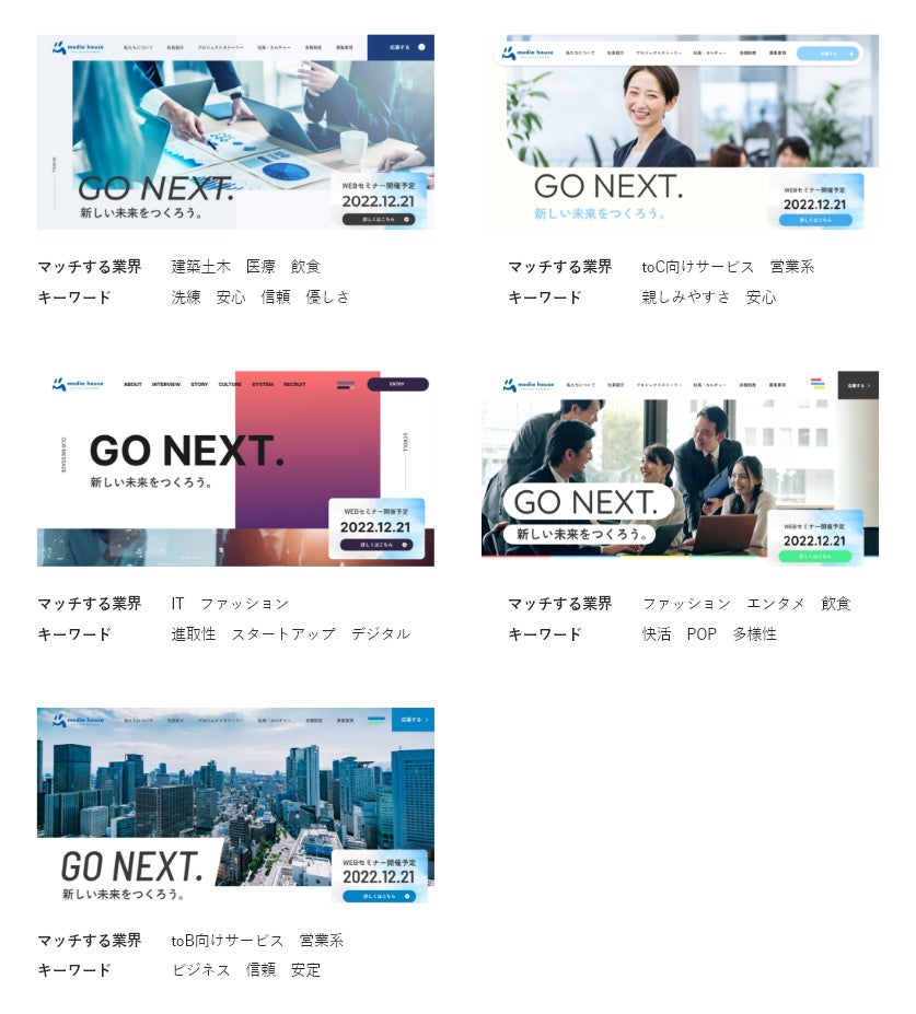 サイトのデザインは、事業の特性や企業の特徴に合わせて、5つのテンプレートからお選びいただけます。