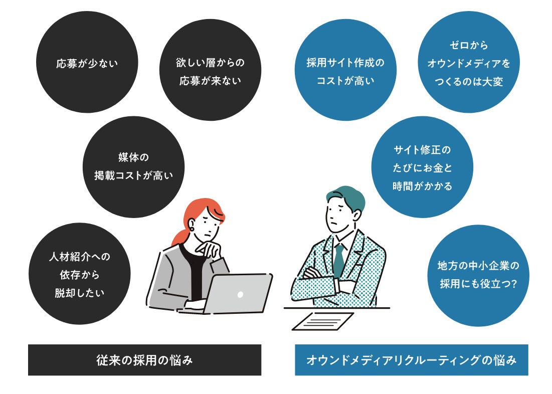 そんなオウンドメディアリクルーティング時代の採用担当者の皆さまからは、従来の悩みに加えて、オウンドメディアリクルーティングに対応していくことに対する不安も多く寄せられています。