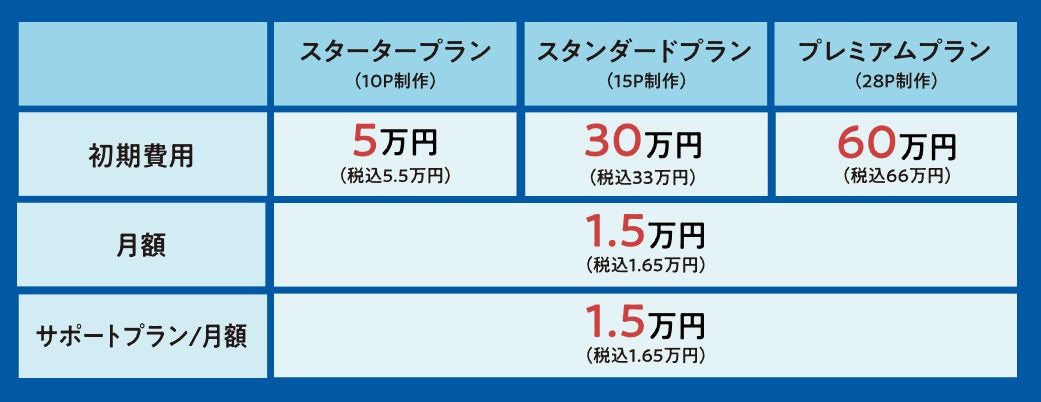 料金は、シンプルな3プラン。3プランともに手頃な月額1.5万円(税込1.65万円)となっています。サポートプランをつける場合は、別途月額がかかります。