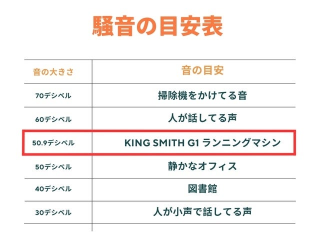新型G1ランニングマシンには、最先端のパワフルかつ静音モーターが搭載されております。通常ランニング時(8km/h)のモーター音は50.9デシベルです。これは、人の話し声よりも小さな音、静かなオフィスと同等レベルとなります。