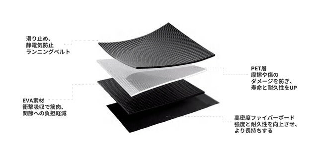 独自開発の4層構造で最先端の衝撃吸収ランニングボードを搭載しているので、関節と筋肉への負担を減らし、初心者でも疲れにくく、怪我のしにくい効率的なランニングが行える構造になってます。