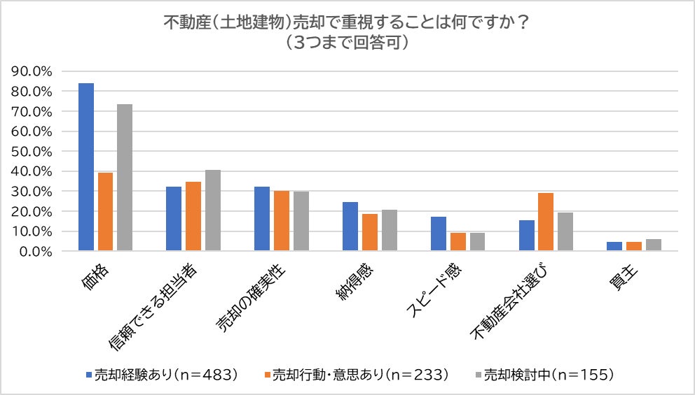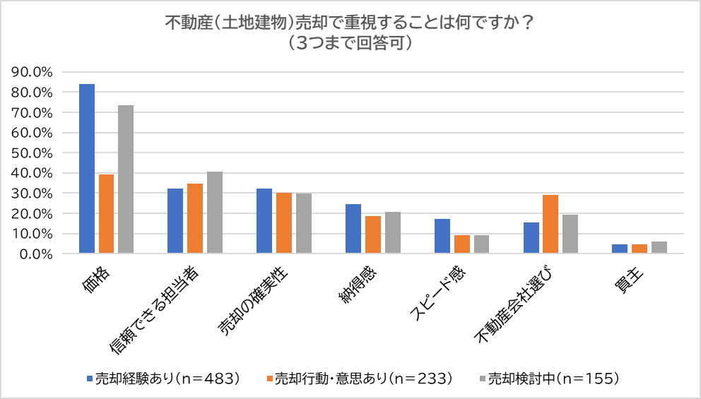 「売却経験あり」「売却行動・意思あり」「売却検討中」と回答した人に「不動産(土地建物)売却で重視すること」を尋ねたところ、「価格」(経験あり:83.9%、行動・意思あり:39.1%、検討中:73.5%)が最多で、「信頼できる担当者」(経験あり:32.3 %、行動・意思あり:34.8%、検討中:40.6%)、「売却の確実性」(経験あり:32.3%、行動・意思あり:30.0%、検討中:29.7%)と続きました。