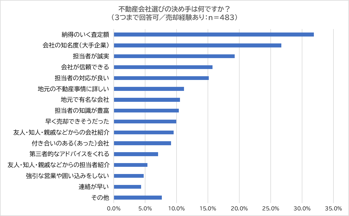 最後に、「売却経験あり」と回答した人に「不動産会社選びの決め手」を尋ねました。最多は「納得のいく査定価格」(31.9%)。「会社の知名度(大手企業)」(26.7%)、「担当者が誠実」(19.3%)、「会社が信頼できる」(15.7%)、「担当者の対応が良い」(15.1%)と続きました。
