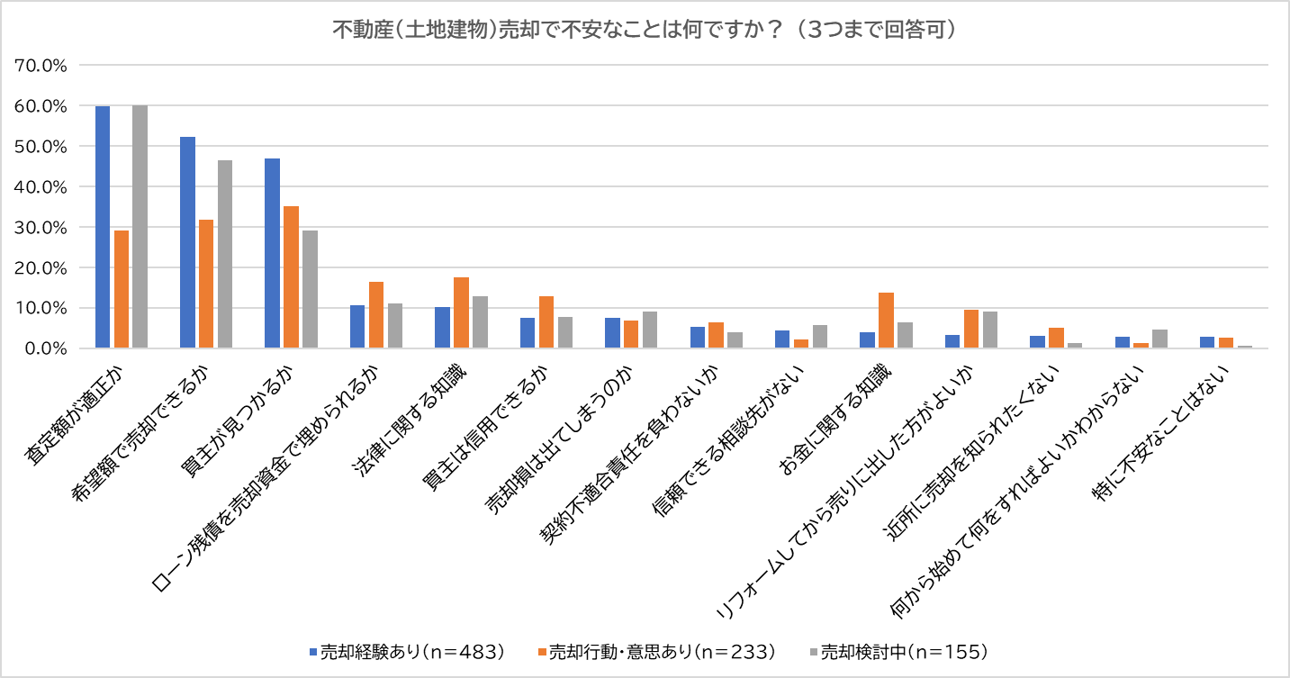 今度は続いて、「不動産(土地建物)売却で不安なこと」を尋ねたところ、経験ありと検討中では「査定額が適正か」(経験あり:59.8%、行動・意思あり:29.2%、検討中:60.0%)が最多で、「希望額で売却できるか」(経験あり:52.4%、行動・意思あり:31.8%、検討中:46.5%)となりましたが、行動・意思ありでは「買主が見つかるか」(経験あり:47.0%、行動・意思あり:35.2%、検討中:29.0%)が最多でした。