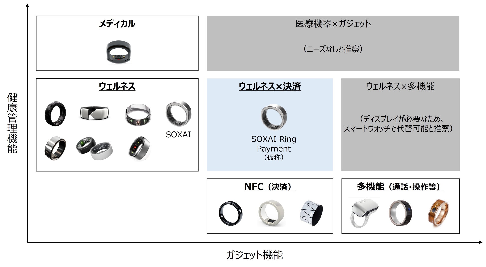 現状のスマートリング市場は、健康管理用製品とガジェット製品*に分かれています。当市場において、SOXAIは健康管理機能と決済機能を併せ持った世界初の製品を実現します。