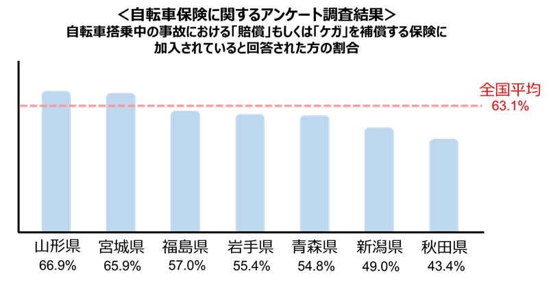 一方、全国の自治体では、自転車利用者が加害者となる高額賠償事例の発生などを理由に、住民に対して自転車事故に備える保険の加入を義務化する動きが進んでおり、東北では、山形県、宮城県に続き、本年4月より、秋田県および福島県において自転車損害賠償責任保険等への加入が義務化されました。加えて、本年10月からは、新潟県においても自転車損害賠償保険等への加入が義務化される予定です。ただ、昨年実施したアンケート結果によると、東北・新潟では、山形県、宮城県を除いて、自転車損害賠償保険等の加入率は全国平均よりも低い状況にあります(下図)※1。
