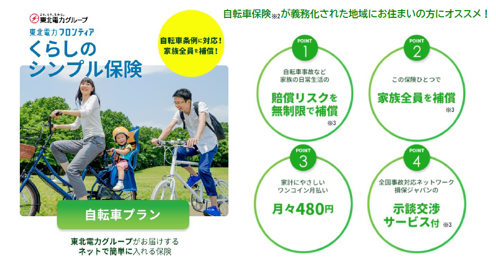 「東北電力フロンティア くらしのシンプル保険(自転車プラン)」は、“ネットでカンタン申込”、“家計にやさし
