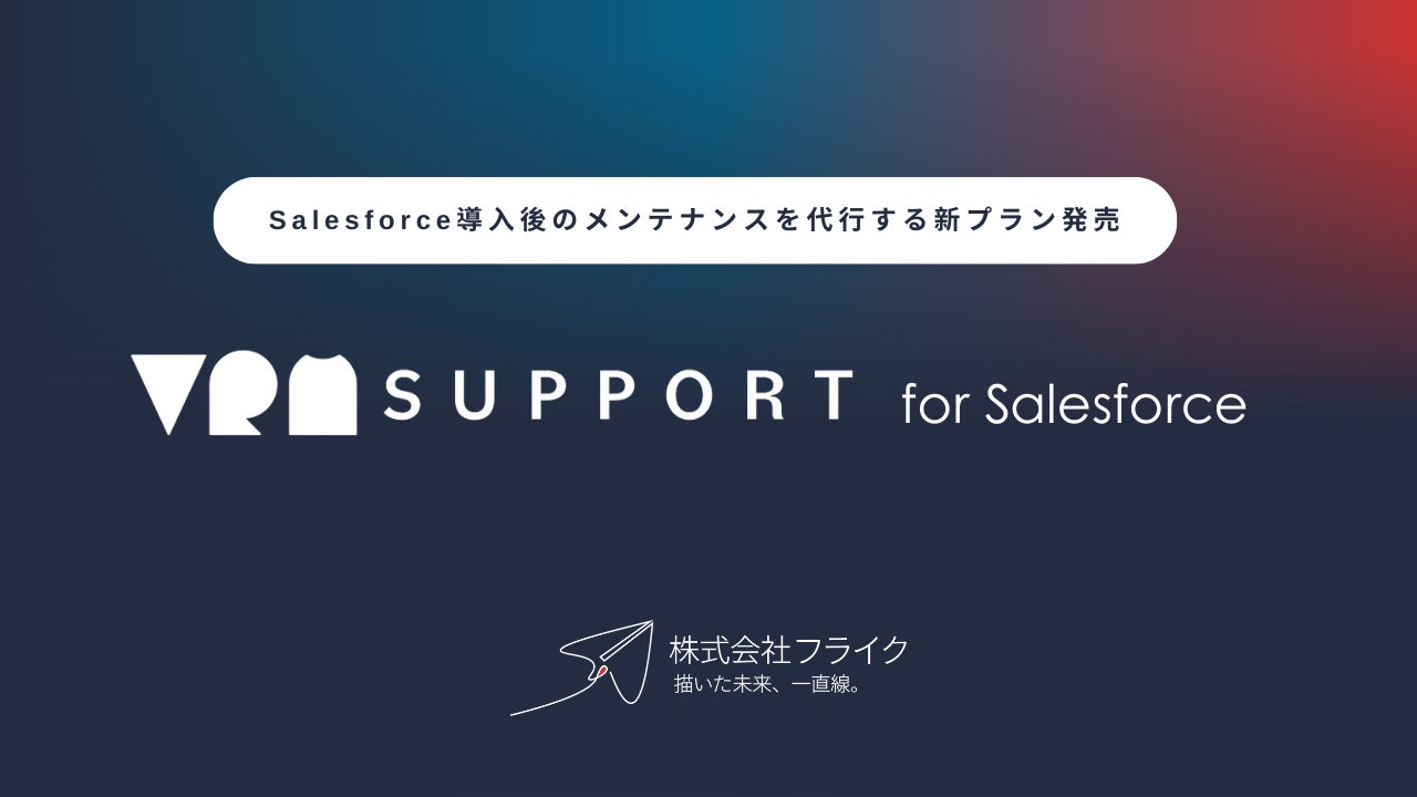 システムを用いて『できない』を『できる』にする組立屋の株式会社フライク(本社:福岡県福岡市、代表取締役:大瀧 龍、以下「フライク」)は、Salesforceエンジニアの案件単価高騰を受け、Salesforce導入後の継続的な運用を代行できる新プラン『VRM SUPPORT for Salesforce 』を2024年3月21日より販売開始いたします。価格は月額2万円からとなっております。Salesforceエンジニアを費用面で内製化できない中小企業を対象に、Salesforceを導入後も利活用できる仕組みを支援することを目指します。