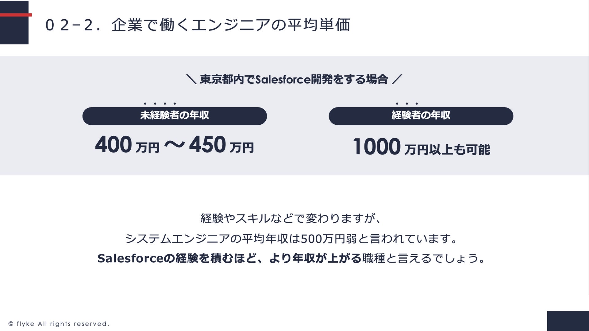 フリーランスのSalesforceエンジニアの年収は、1,080万円から1,800万円に上ります。特にSalesforceの開発能力を持つエンジニアの市場価値が高く、希少性が増しています。企業に所属するエンジニアの場合でも、未経験者の初年度給与が400万円から450万円、経験者では1,000万円以上の年収が一般的です。また、一人のSalesforceエンジニアを採用し、育成し、企業に定着させるためのコストは、5,000万円を超えることもあります。