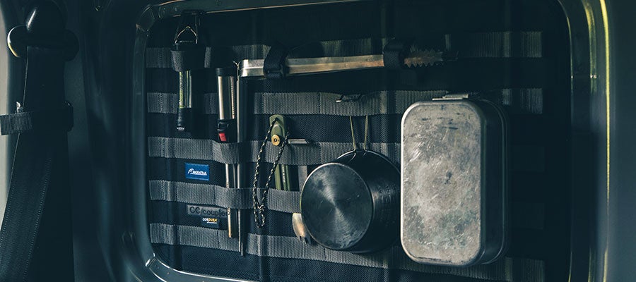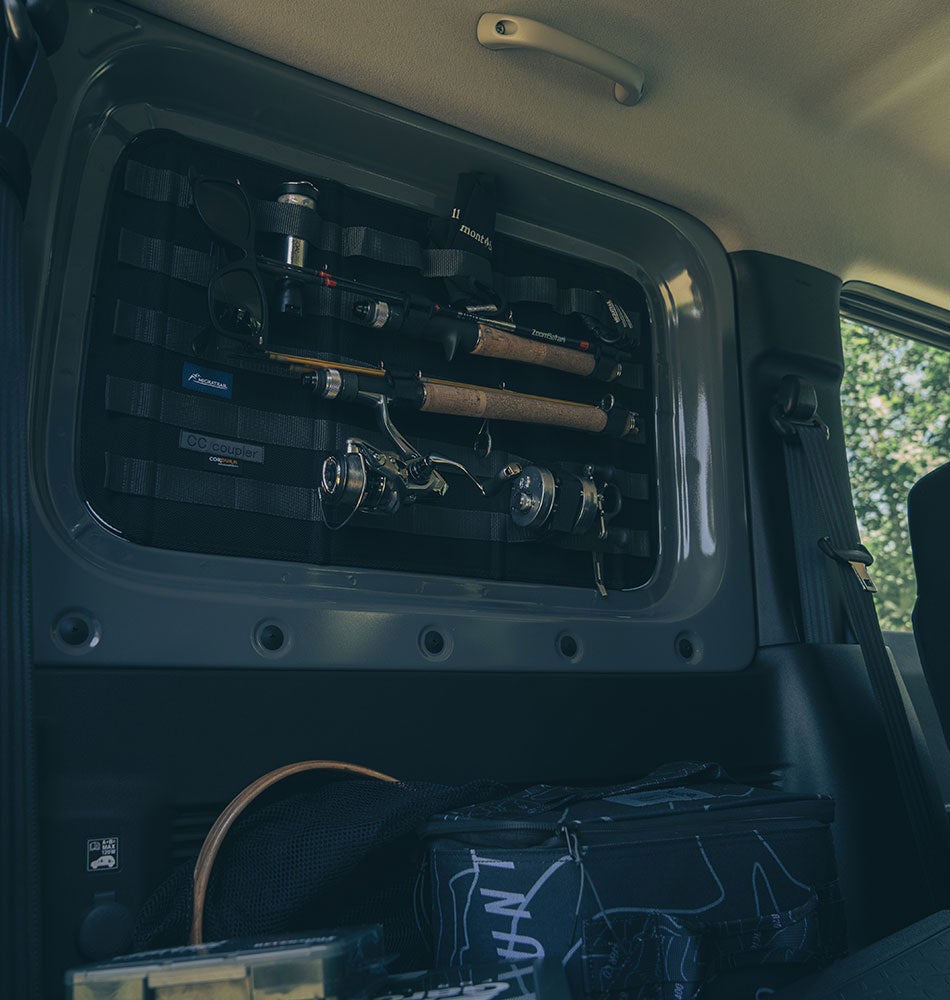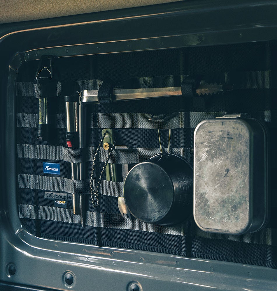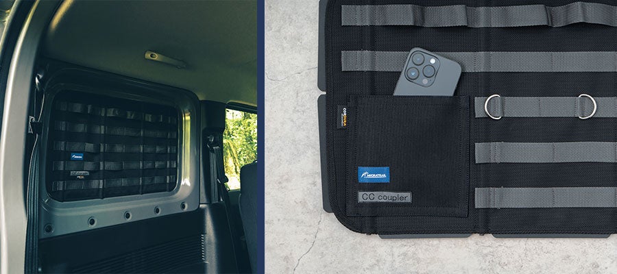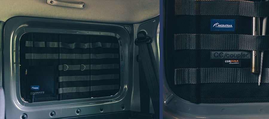 ジムニーのリヤサイドウインドウを埋めるシェード。 プライバシーを確保し、真夏の日差しや真冬の冷気を和らげる。シェード内側に配置されたモールシステムにより、キャンプギアや釣り道具などを便利に収納し、ジムニーを機能的なスタイルへ変える。 大阪府にある「CCcoupler」と「ミグラトレイル」のコラボレーションによる高品質な仕上がり。 CCcoupler 大阪府を拠点とするブランドで、「車=Car」「野営=Camp」「帆布=Canvas」の“C”を結ぶ接合品「カプラー=coupler」という意味で「CCcoupler」と名付けられた。主にハイエース、キャラバンのシェードを得意とし、企画から製造、販売までを行っている。 工房での丁寧な作業により、高精度かつ高品質な商品を提供する、 Made in Japanの企業である。