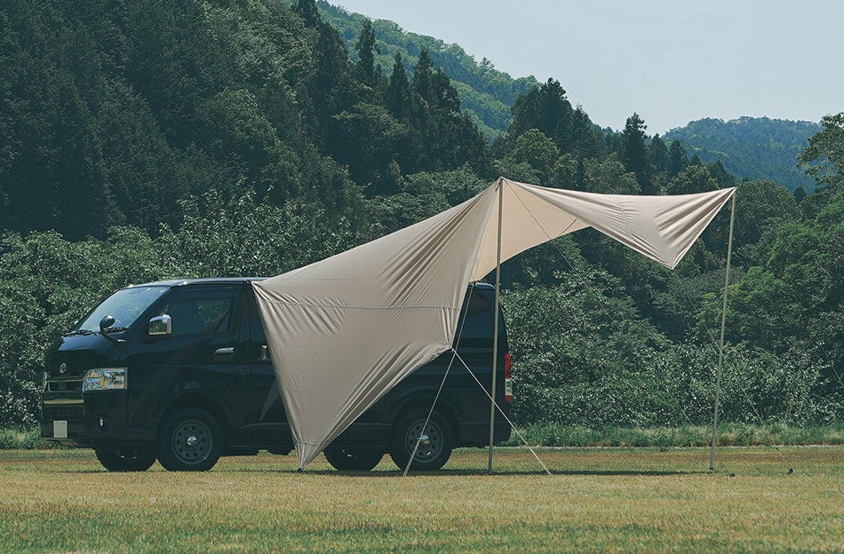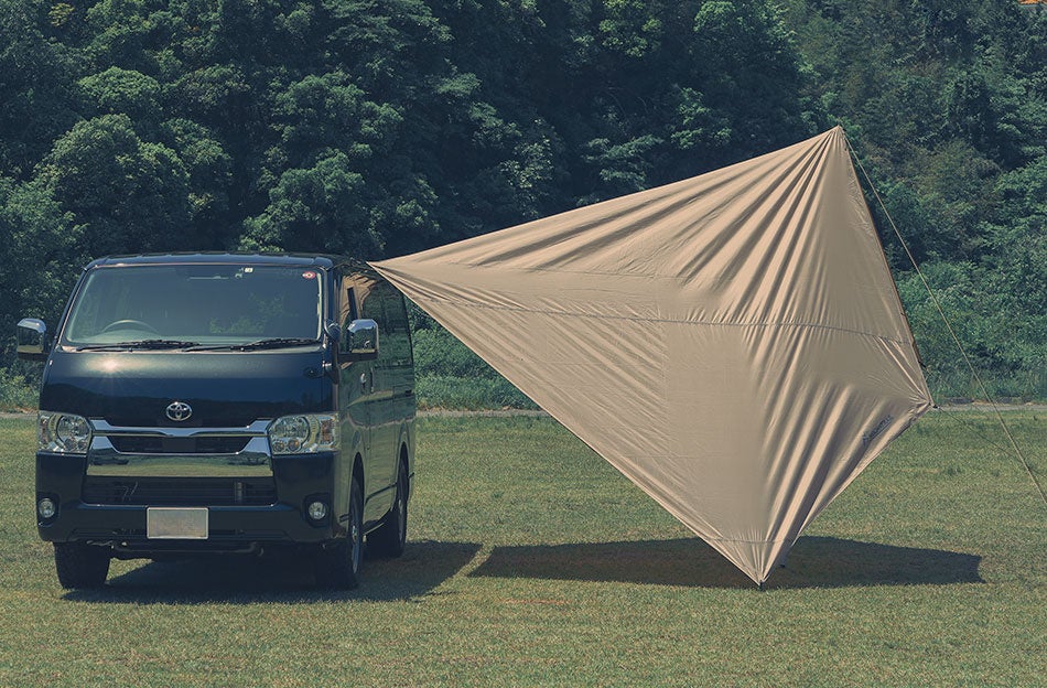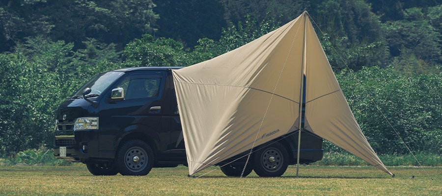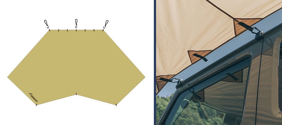 車と連結しタープの形状を多彩な設営バリエーションに合わせ、日陰やプライベート空間をコントロール。車両と接続した設営に特化した大型カーサイドタープは、ソロからファミリーまで快適なカーサイドリビングサイトを演出する。