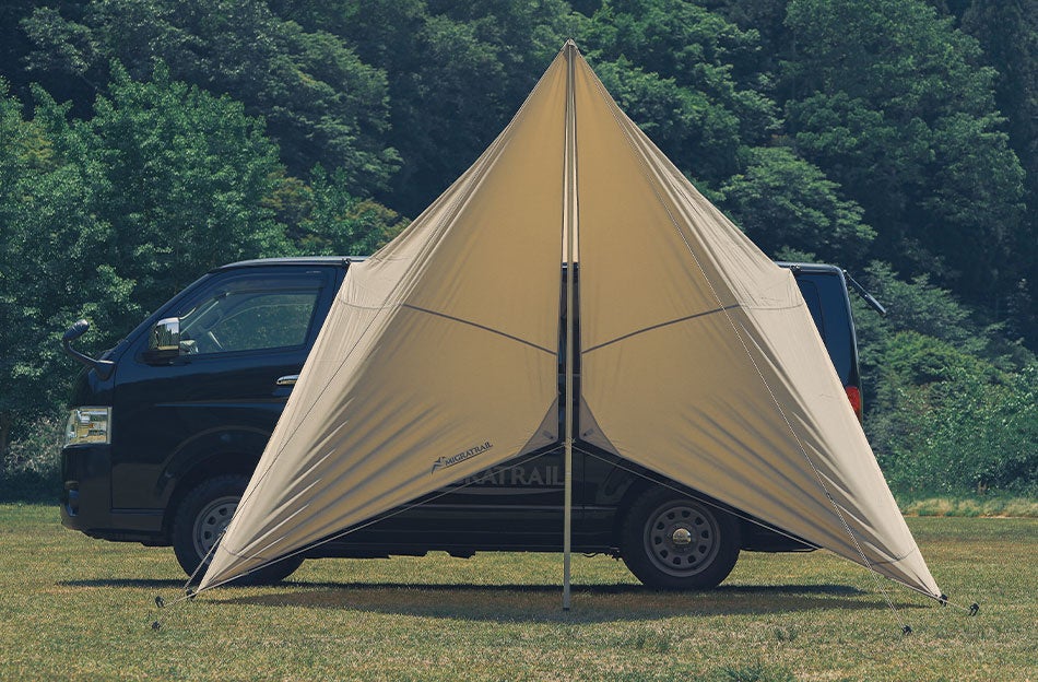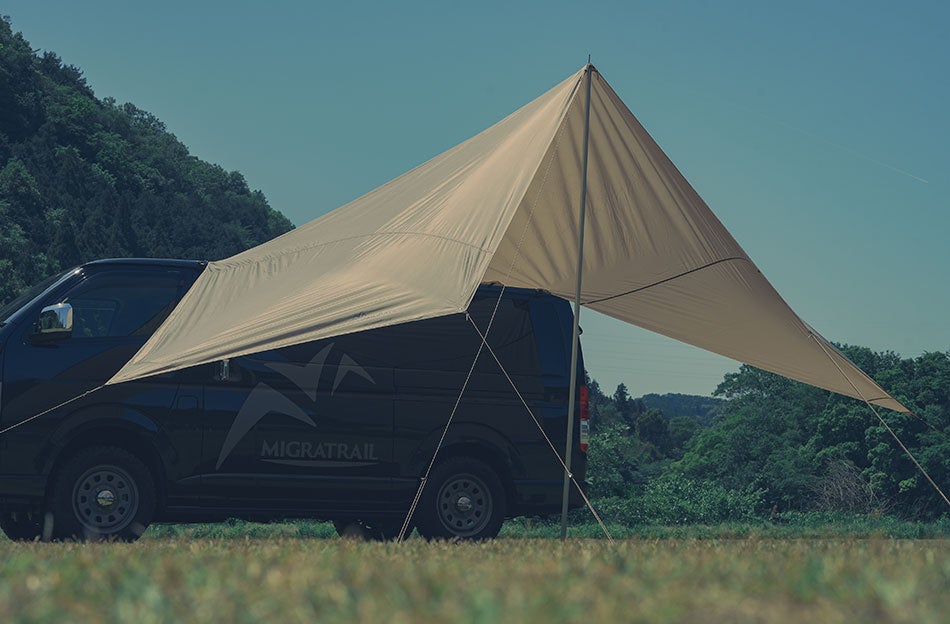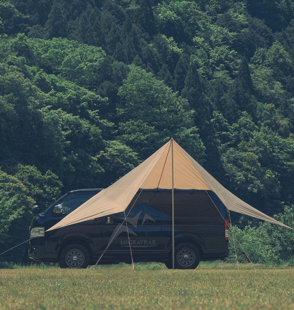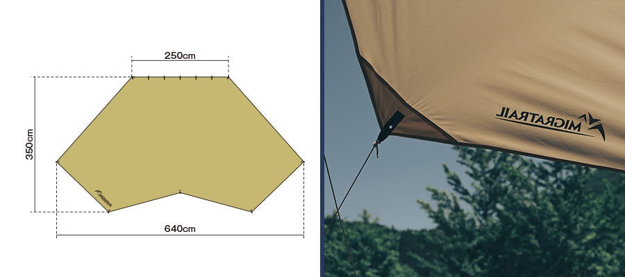 設営時には、ヘキサタープのようなエッジが利いた美しいシルエットとワンポイントMIGRATRAILロゴ入り。