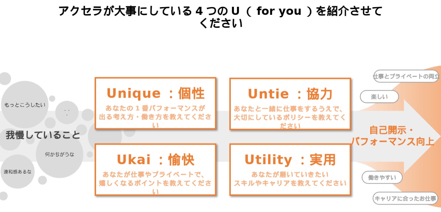 すべての社員が最大限のパフォーマンスを発揮できる環境を提供し、多様な価値観を尊重する採用を行っています。私たちは、以下の4つの「U」を軸に、一人ひとりの個性やキャリアを大切にしています。