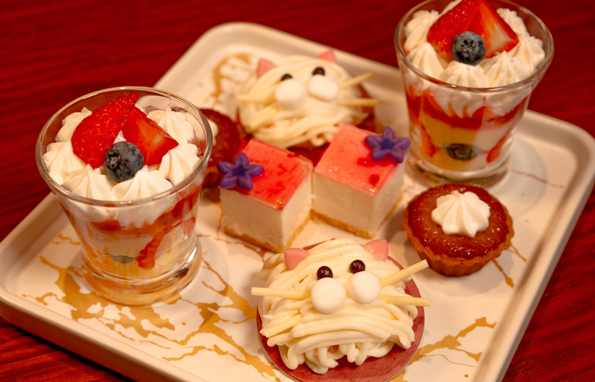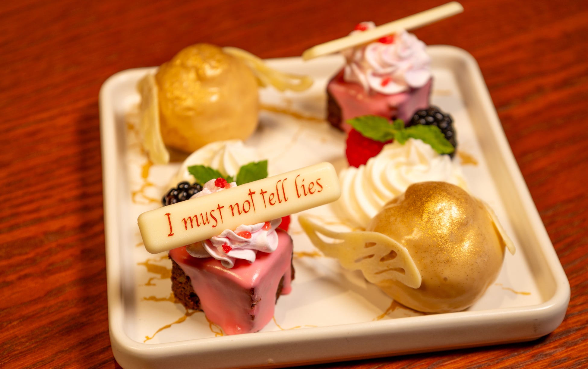 「アンブリッジ教授のアフタヌーンティー」は、英国式アフタヌーンティーでは欠かせない、焼きたてのスコーンをはじめ、こだわりのセイボリーやスイーツにハリー・ポッターらしさを取り入れた、ここでしか味わうことのできないメニューです。「金のスニッチ」をモチーフにした「金のスニッチシュー」といったおなじみのアイテムをはじめ、映画に登場するモチーフやストーリーに着想を得たメニューが並びます。もちろん、メニュー名になっている登場人物、アンブリッジ教授をテーマにしたメニューも。彼女が寵愛する動物、ネコを取り入れた「子猫のレアチーズモンブラン」や、彼女がハリーに罰則を与えたシーンでおなじみのフレーズ「I must not tell lies(僕はウソをついてはいけない)」と書かれたデコレーションがほどこされている「罰則ブラウニー」など、ハリー・ポッター好きにはたまらない、細かなこだわりの詰まったスイーツも味わうことができます。本格的なメニューはもちろん、映画にちなんだアイデアがちりばめられたディテールにもご注目ください。