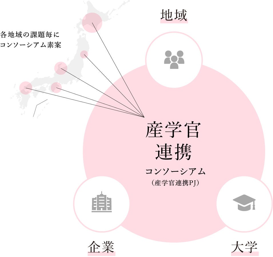 全国の連携地域を中心に共創を引き起こしながら地域の課題に取り組み、innovationを起こしていくチャレンジを産学官連携(コンソーシアム)でおこないます。