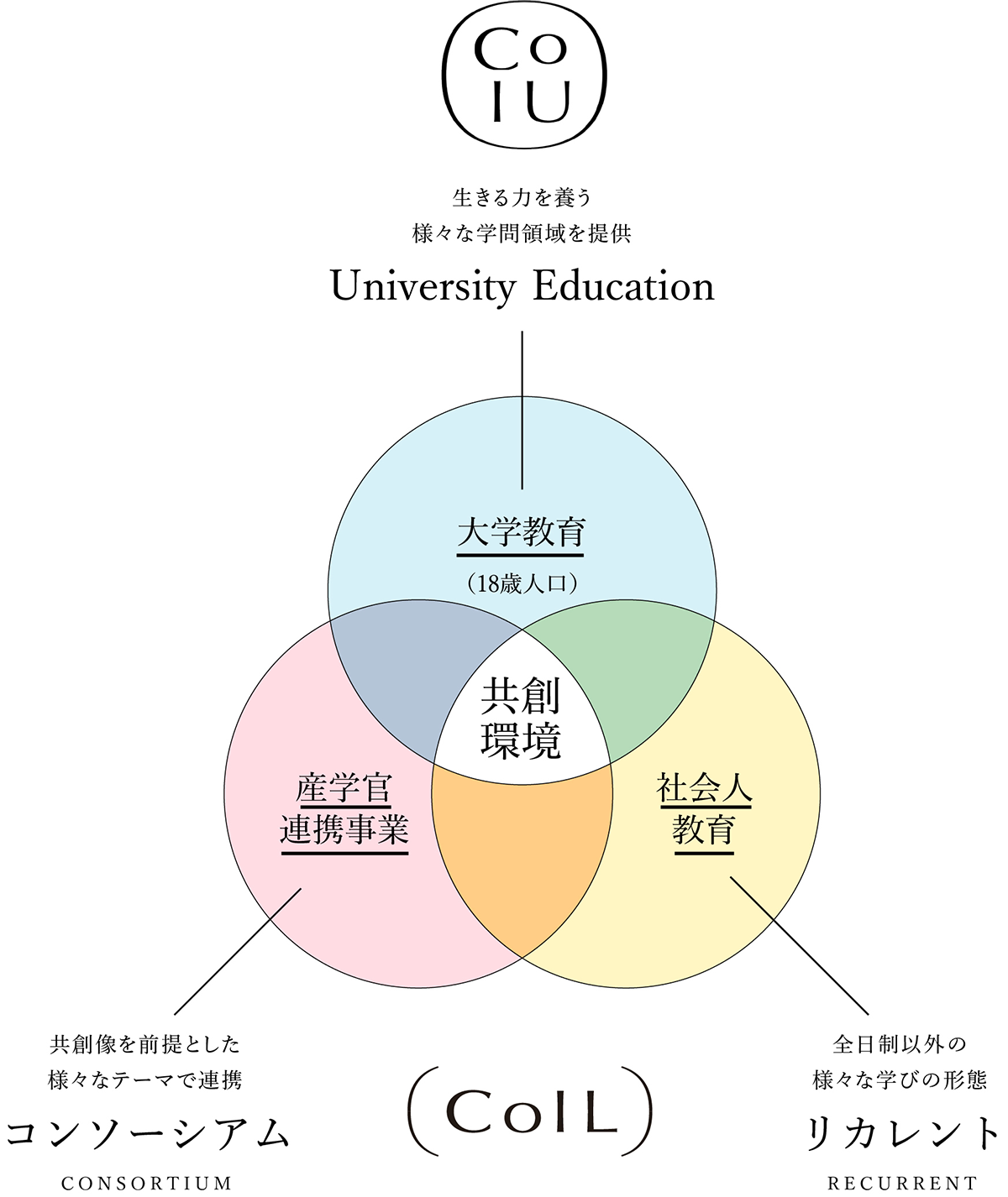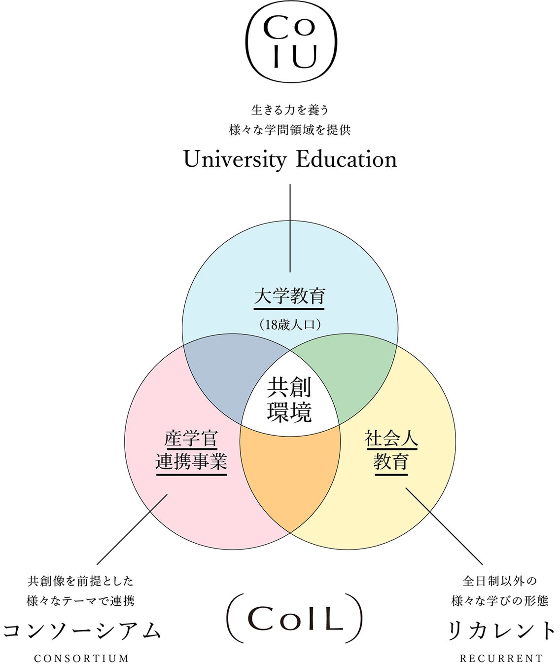 2026年に開学を目指すCoIU(仮称)は、共創学を通じ、「人々がより良く生きる豊かな未来」につながる新たな価値創造を目指し、多様な人々、コミュニティ同士が互いのために補完しあい、またその価値を高めあいながら、持続的に課題解決および社会変革に向け協働することを構想しています。