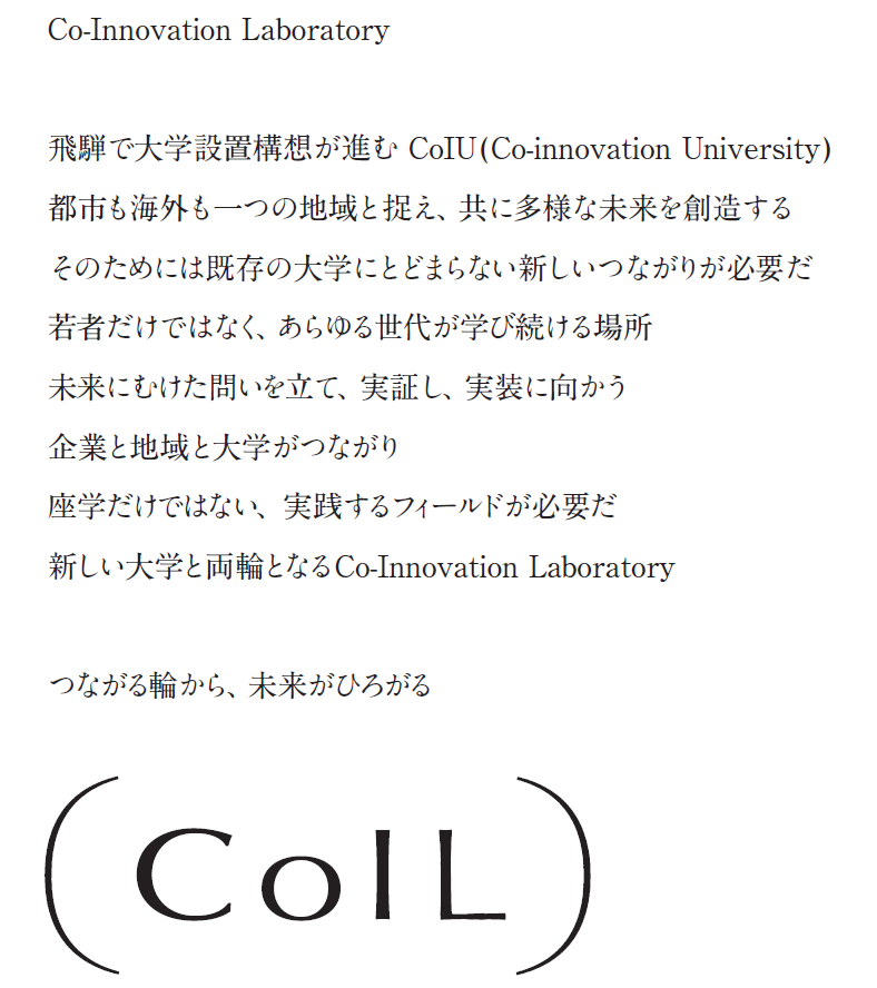 また、新たな価値創造のために、「理論」・「実践」・「対話」を往還するプロセスを通じて、各学問領域における成果を統合し、また、自らの所属する国や地域、組織・立場を越境し、他者との絆を結びながら、課題解決および社会変革を実行していく力を備えた人材の育成を構想しています。その上でCoILは上記の共創環境を創りあげ、促進していくために企業様や地域の方と対話を通じて、様々な構想を行い、地域課題や社会課題の解決に向けた研究と実践をコンソーシアム、リカレントを通じて機関として発足いたします。