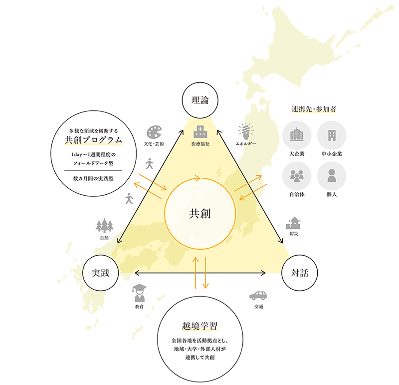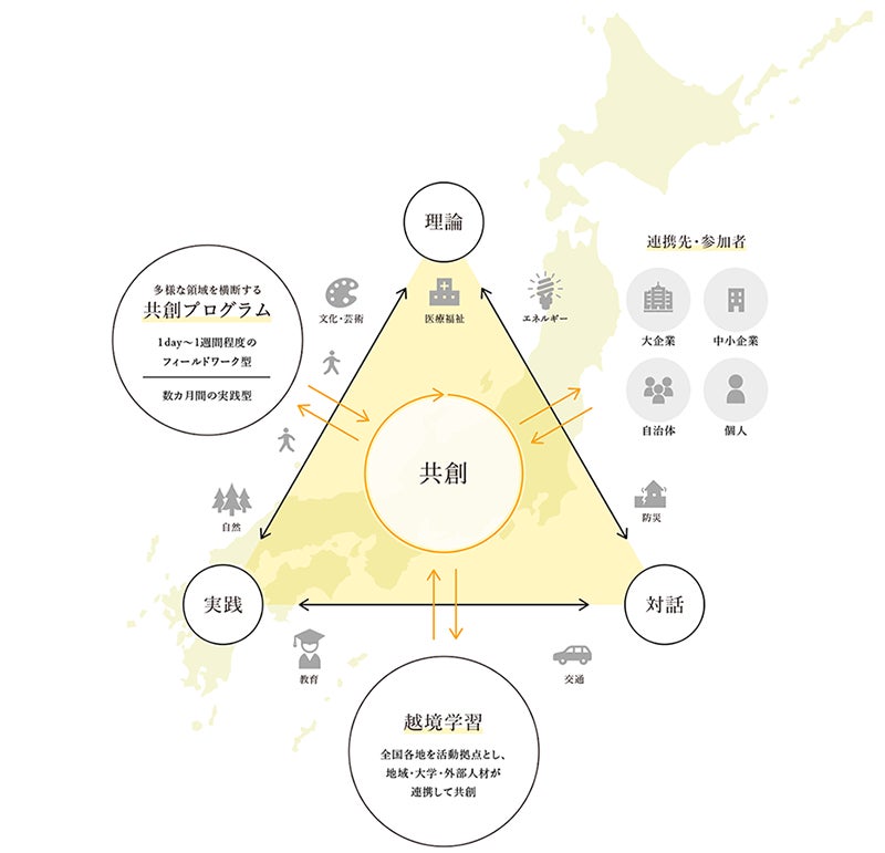 多様な領域の横断しながら、全国15地域の活動拠点で学ぶことができる共創プログラム。